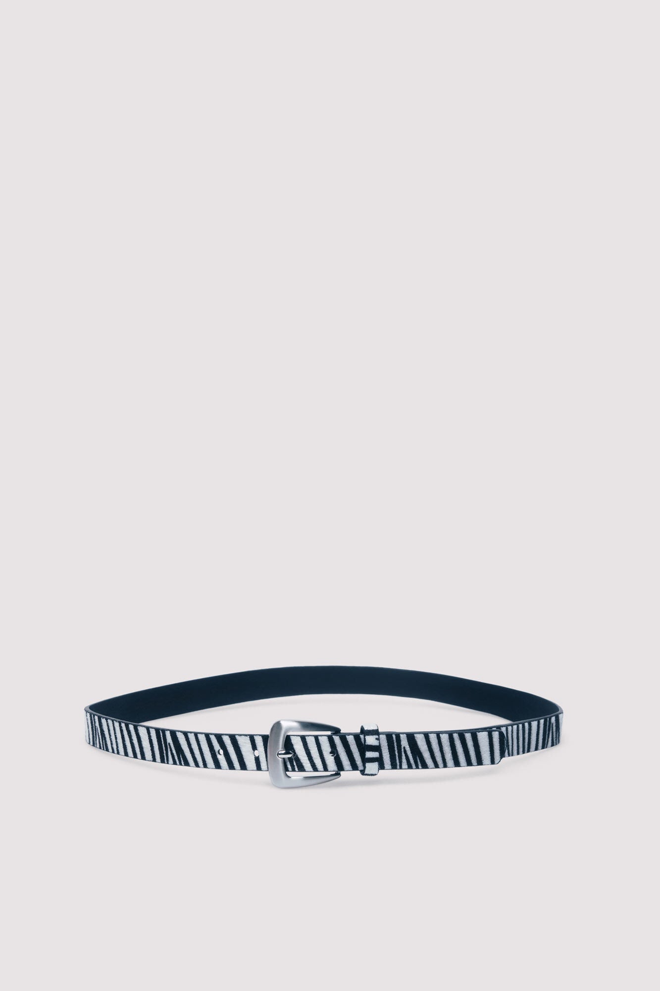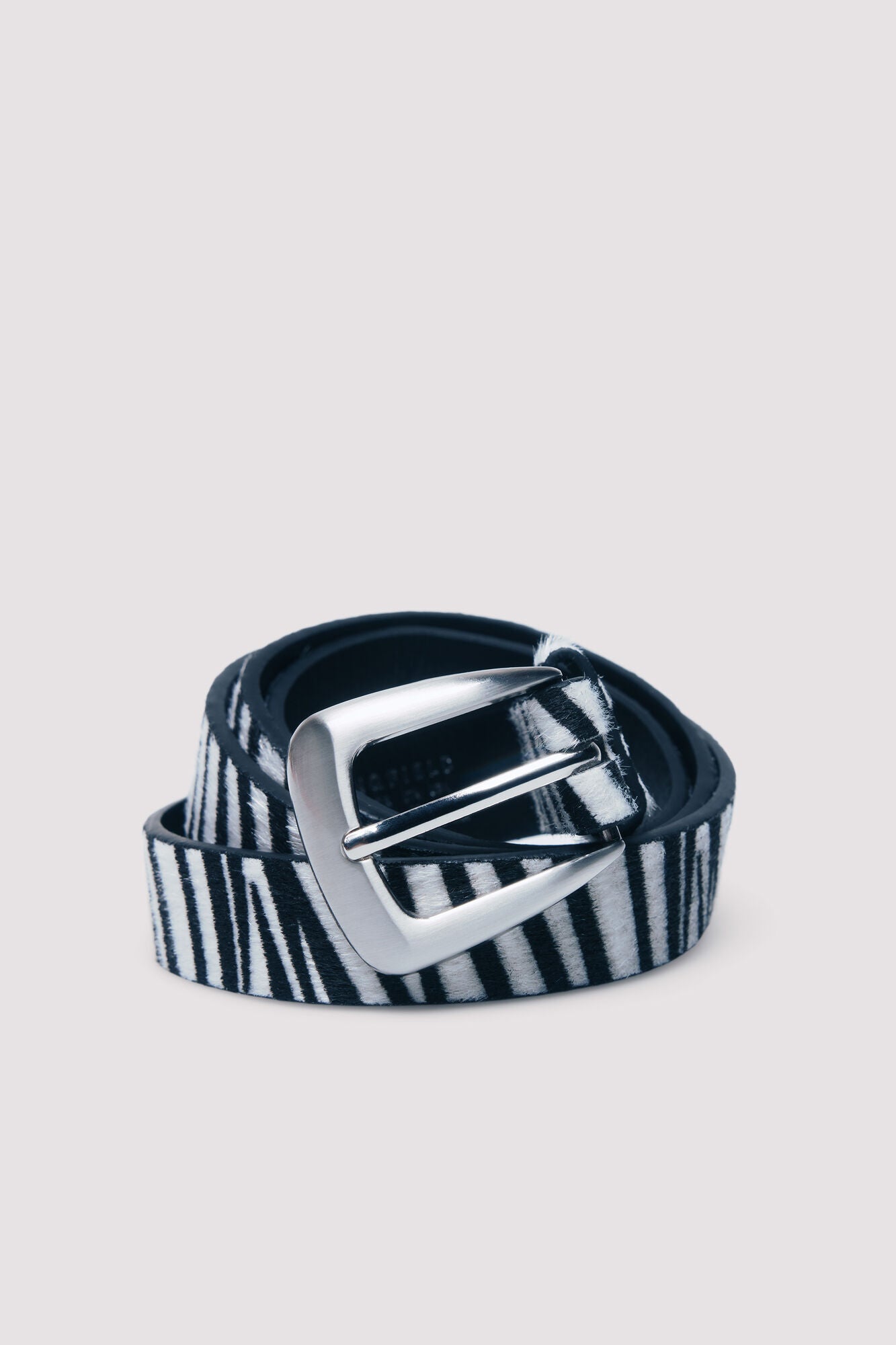 • Cinturón fino con hebilla metálica plateada, con estampado de cebra con textura