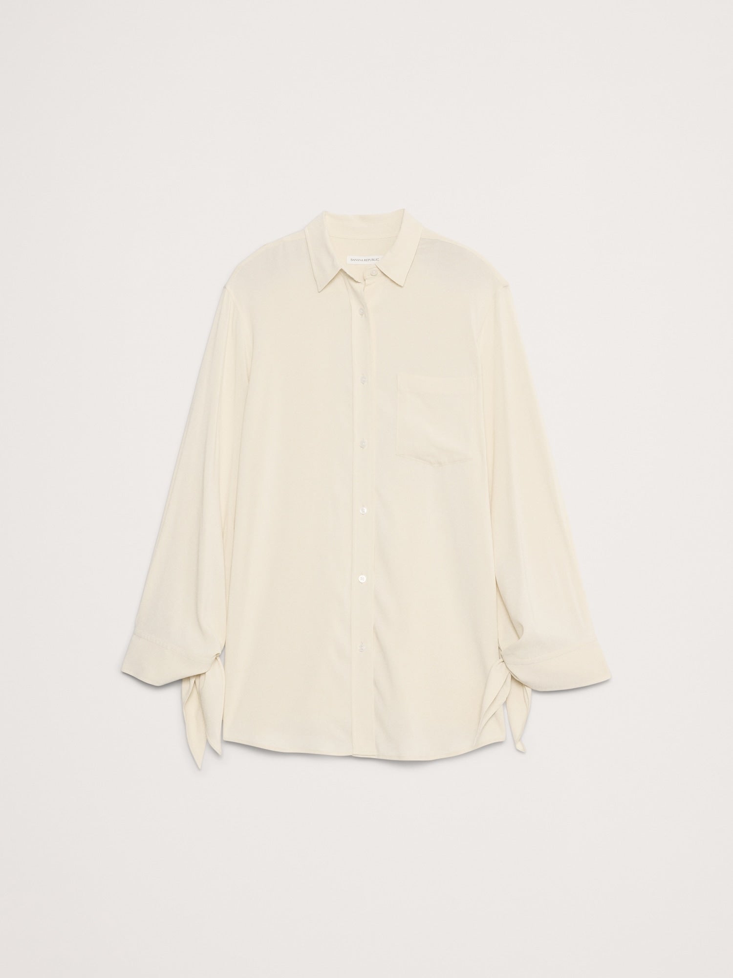 - Hecha a medida, pero sin esfuerzo, confeccionamos esta camisa sencilla con divertidos detalles de lazo en los puños de una tela georgette suave y drapeada que también es semitransparente.