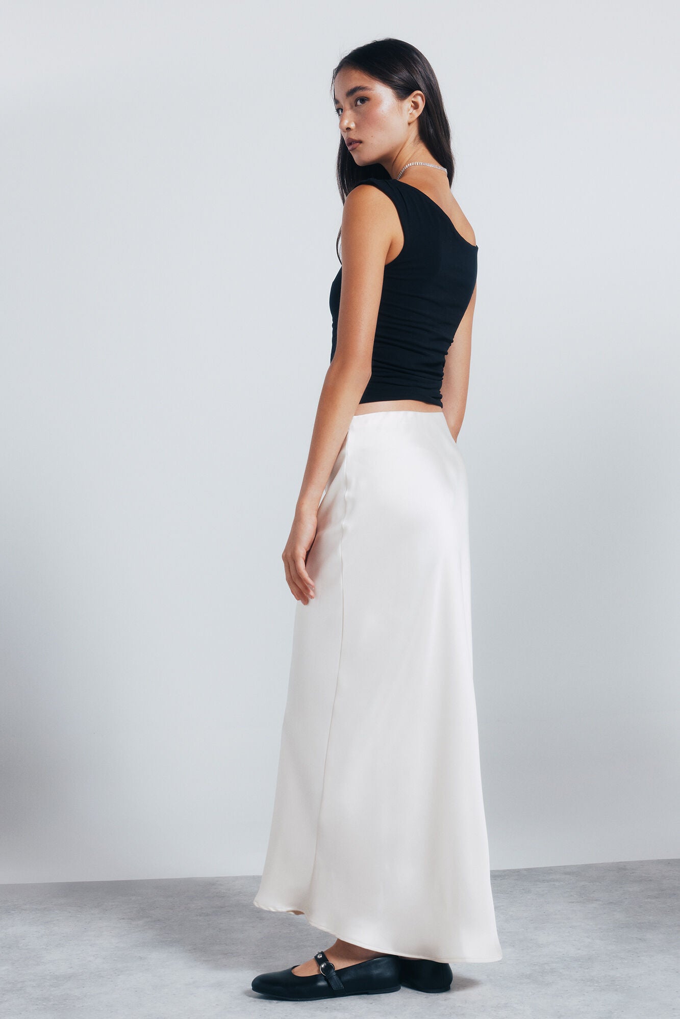 • Enagua midi de talle alto, con goma en la cintura, de color liso y satinada