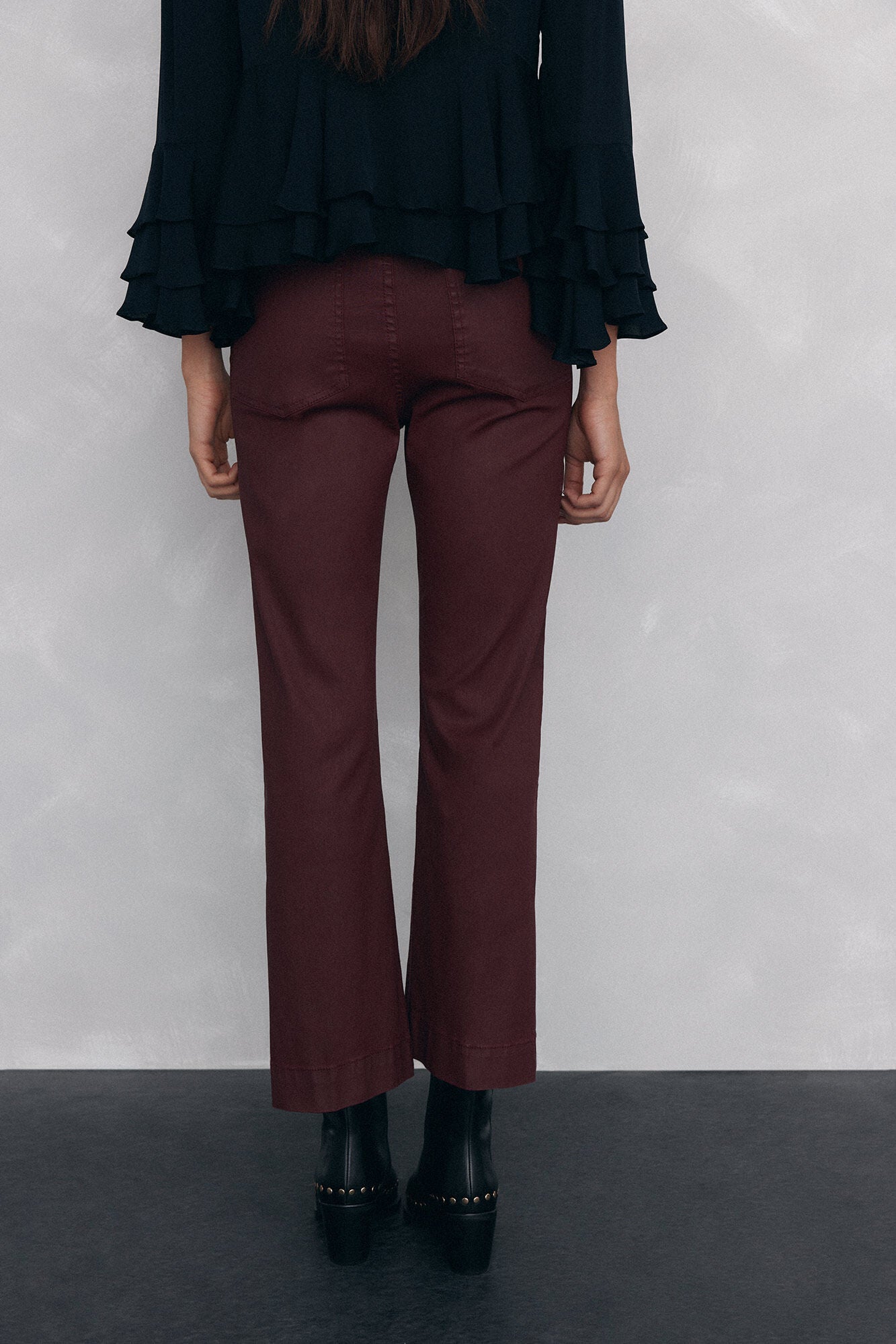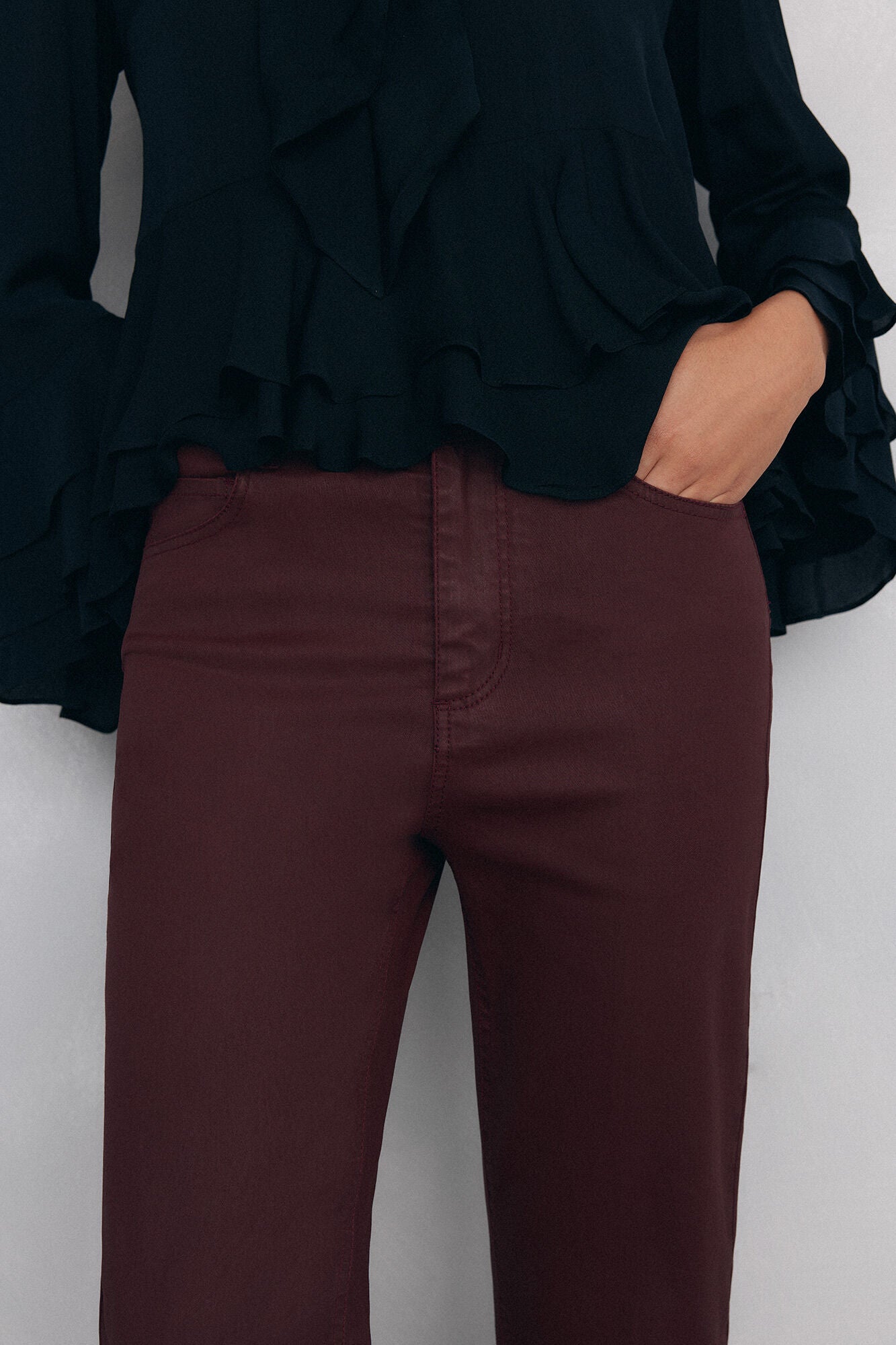 - Pantalón ajustado hasta rodilla y acampanado en el bajo, con diseño de cinco bolsillos.