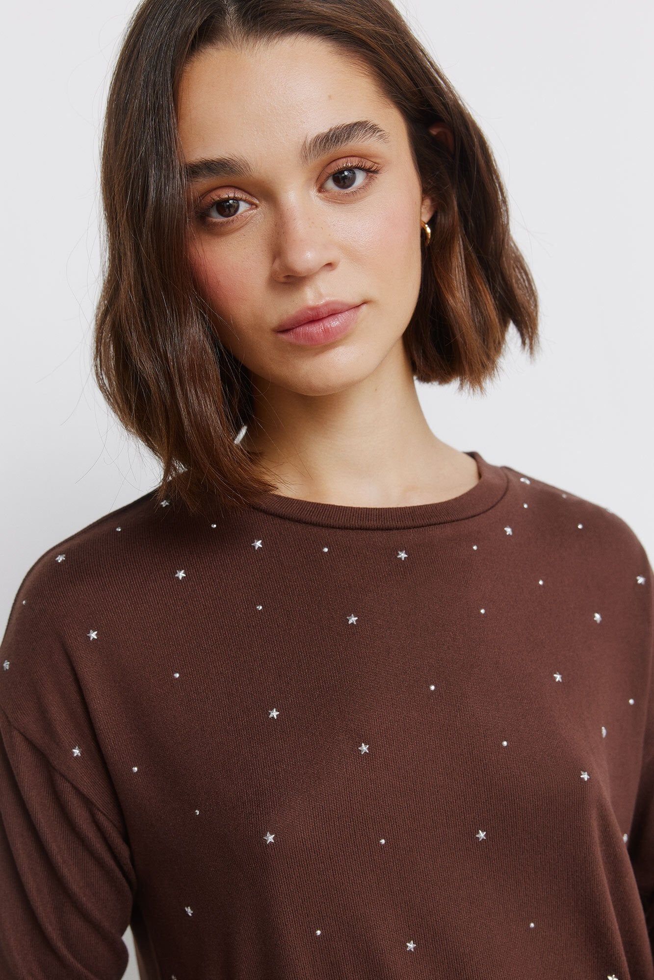 • Camiseta de manga larga caída, con cuello redondo, con detalle de tachas en el delantero y con tacto suave