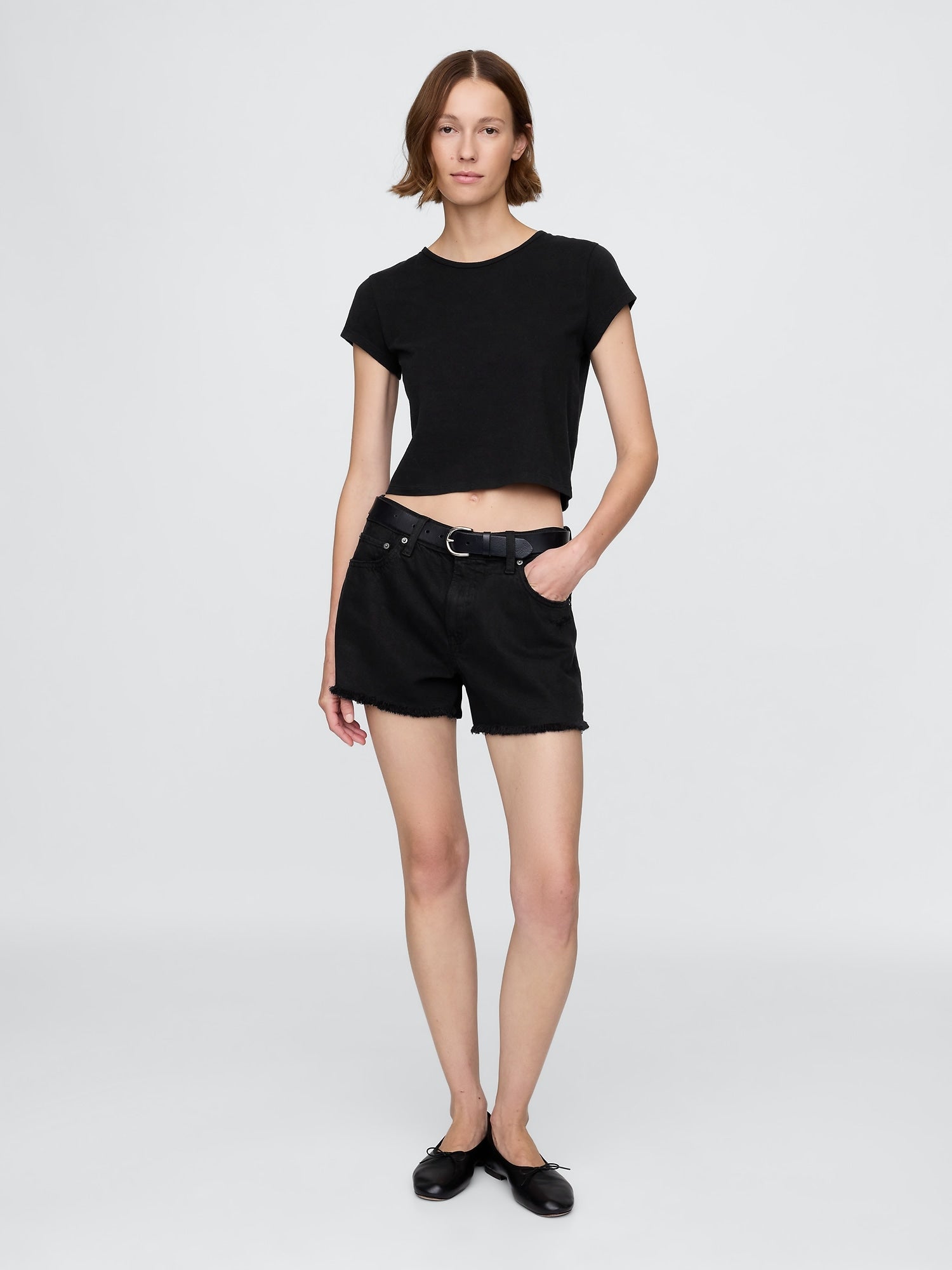 • Look: Un clásico pantalón corto de mezclilla de cinco bolsillos con lavado negro