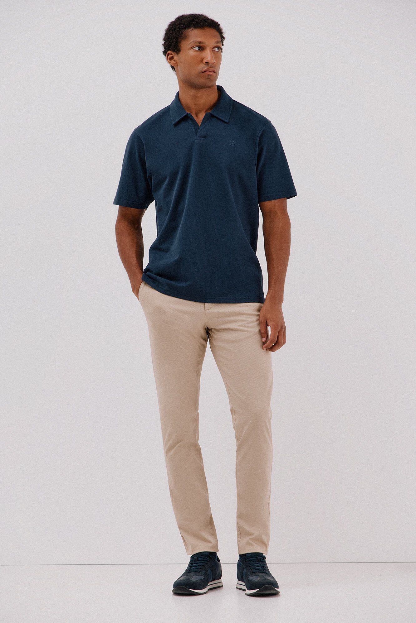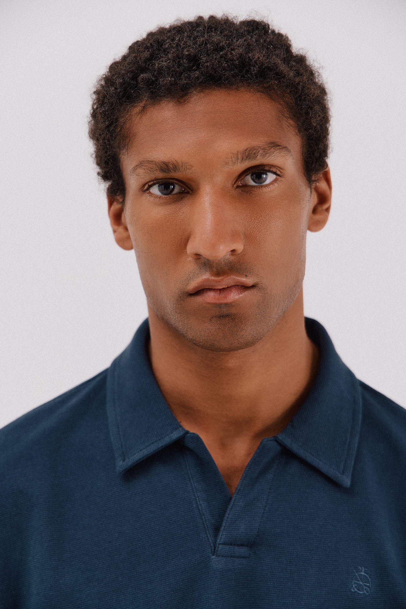 • Cuello en jacquard y logo bordado en el pecho
