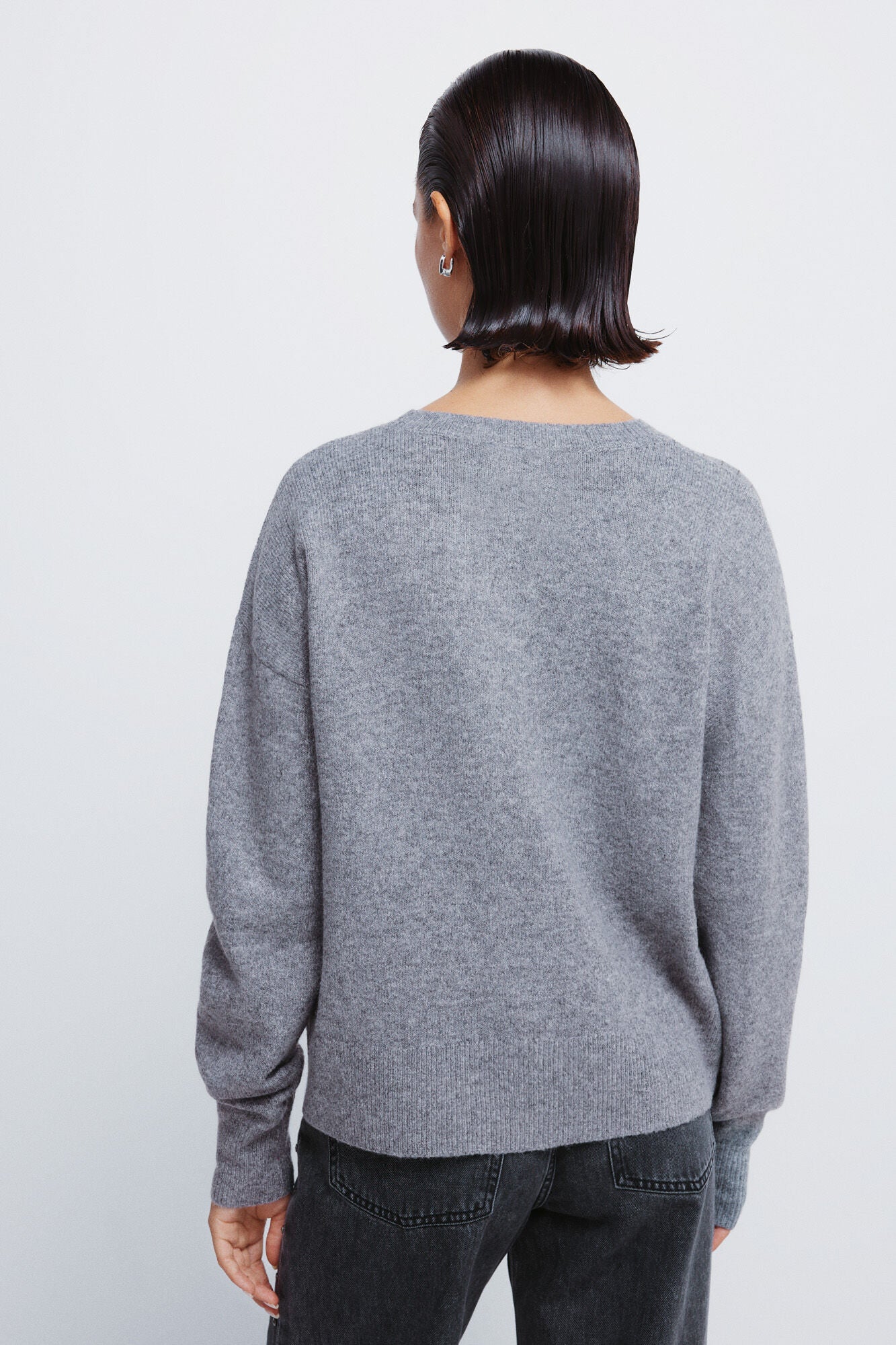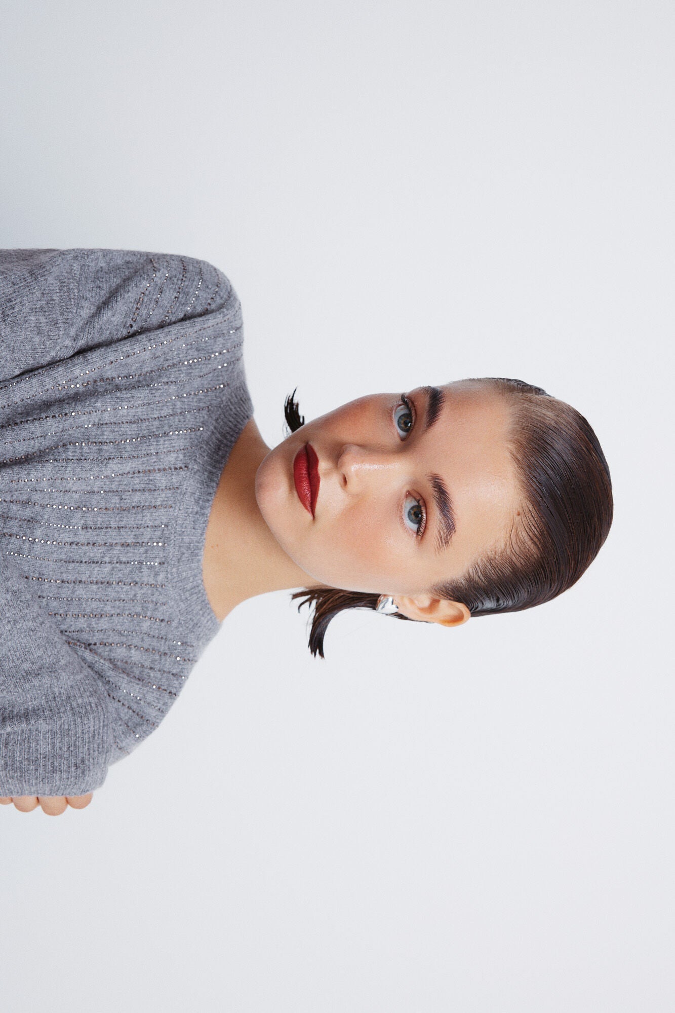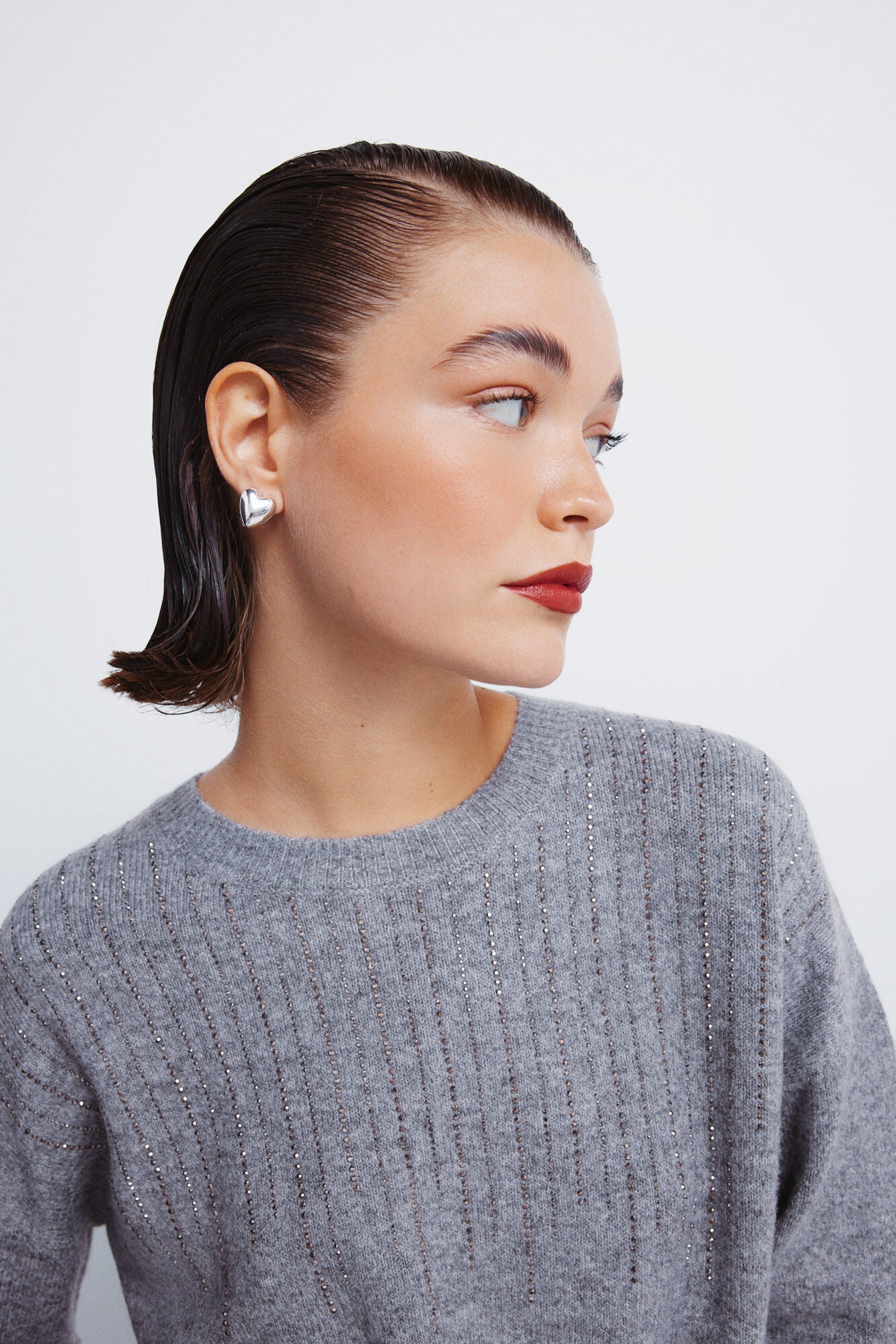 • Cuello redondo y manga larga con detalle de tachuelas de cristal en la parte delantera y ribetes en el cuello , los puños y el dobladillo