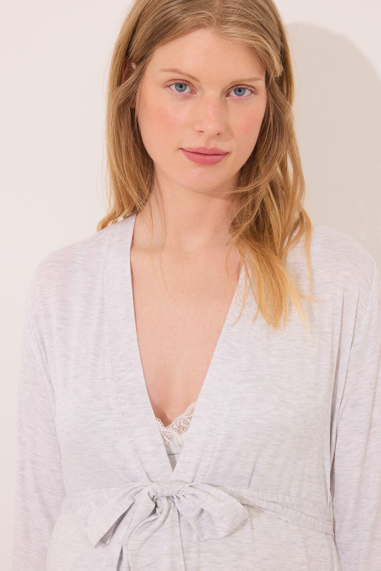 • Bata midi "maternity" de manga larga, en color gris, confeccionada en tejido de viscosa ECOVERO en punto super soft y acabado canalé