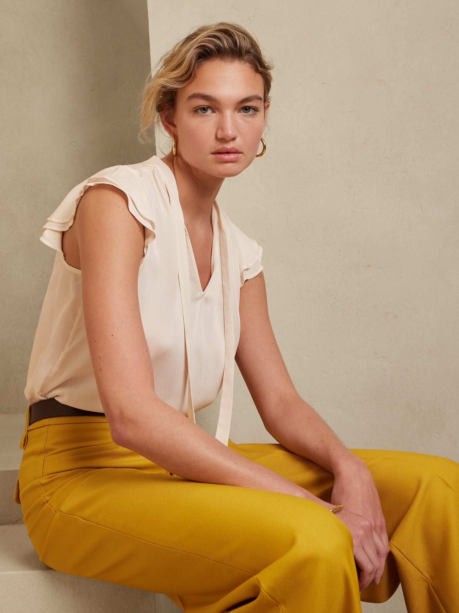 - Ligera y fresca, esta silueta clásica utiliza un cuello anudado y mangas con volantes de doble capa para mayor movimiento. Úselo solo para verlo con todo su efecto, o debajo de una chaqueta y use la corbata para darle un toque masculino