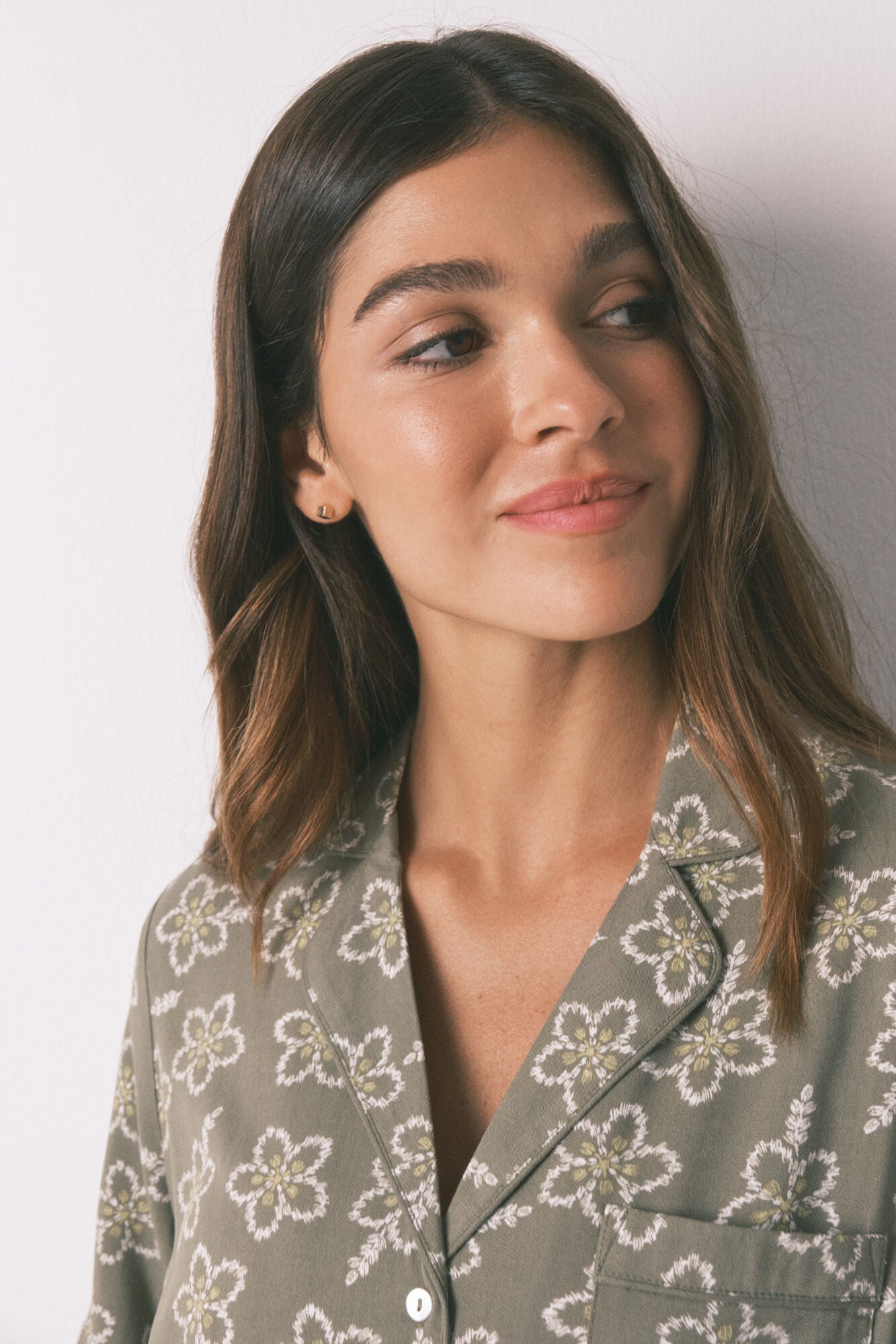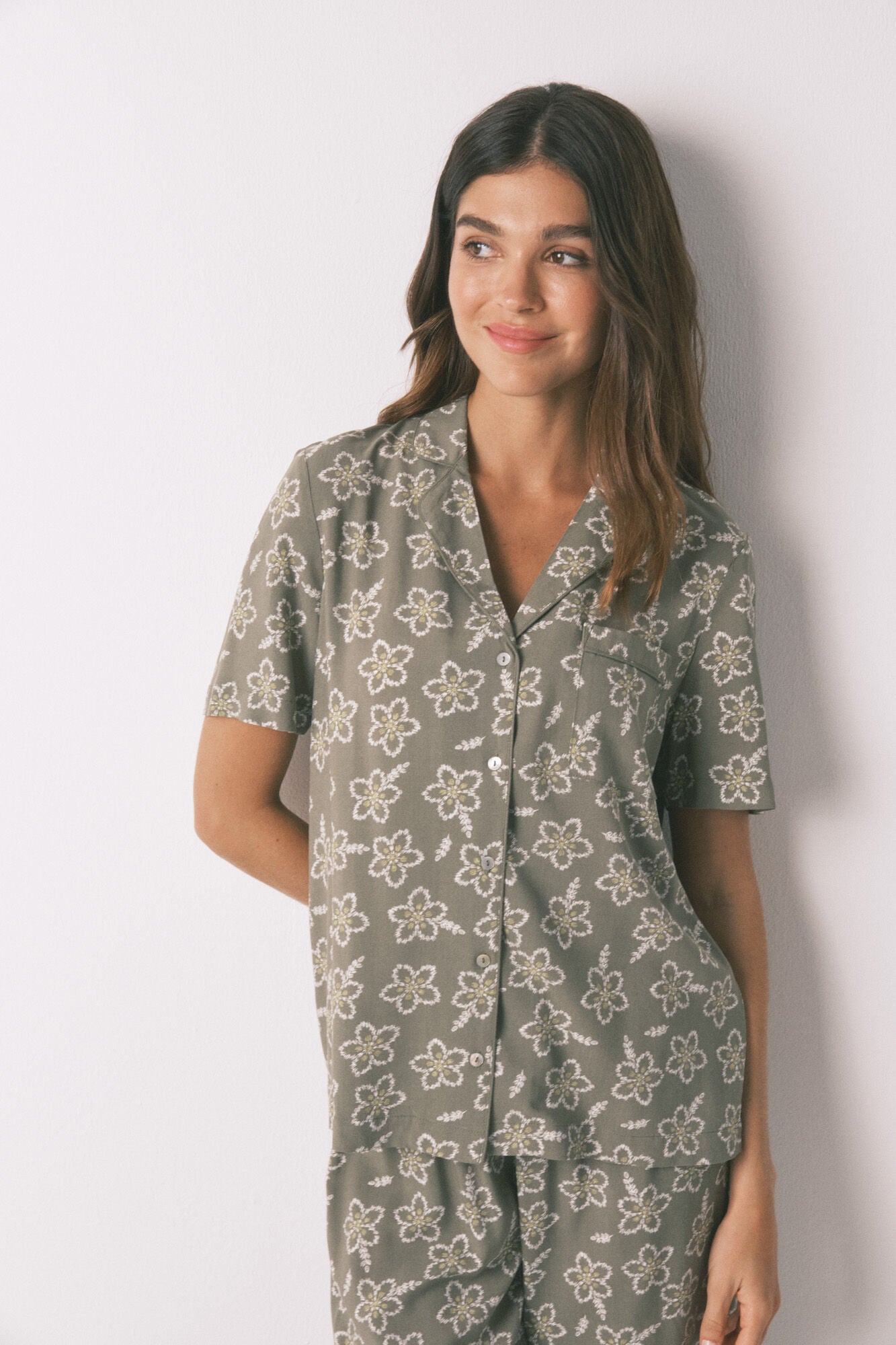 Pijama camisero de manga corta y pantalón capri con estampado allover de flores en viscosa. Top con cuello camisero y botones a tono, bolsillo posicionado en el pecho con detalles de vivos a tono. Pantalón con cinturilla elástica ajustable mediante cordón a tono con borlas. Ideal para dormir o estar en casa muy cómoda.