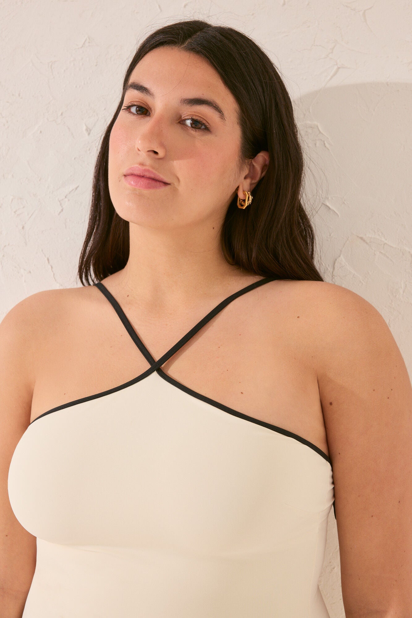 • Precioso bañador en color blanco marfil, con detalle de vivos a contraste y con favorecedor escote tipo halter. Con copas extraíbles y goma bajo pecho para una mejor sujeción