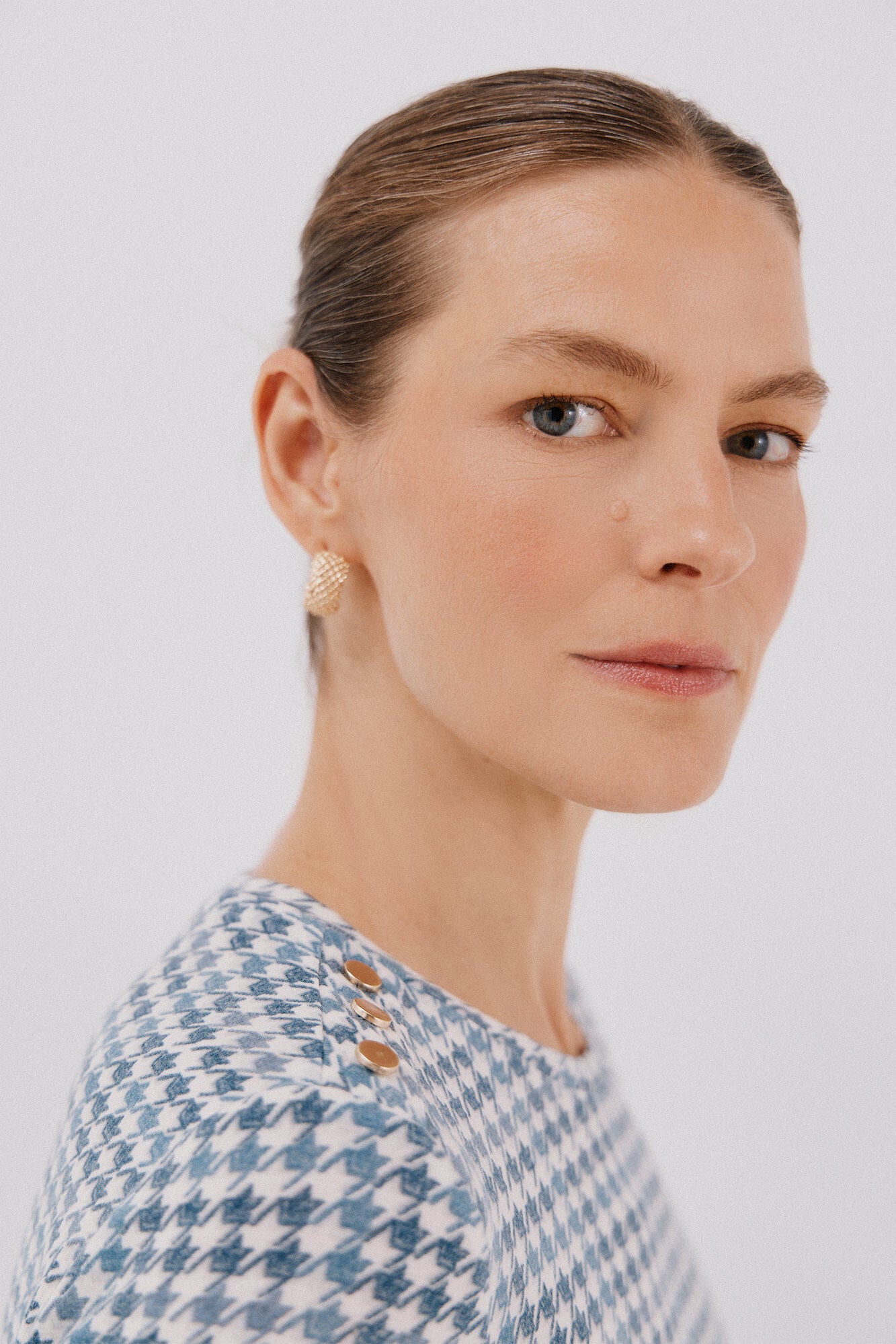 • Escote redondo con botones dorados en hombro