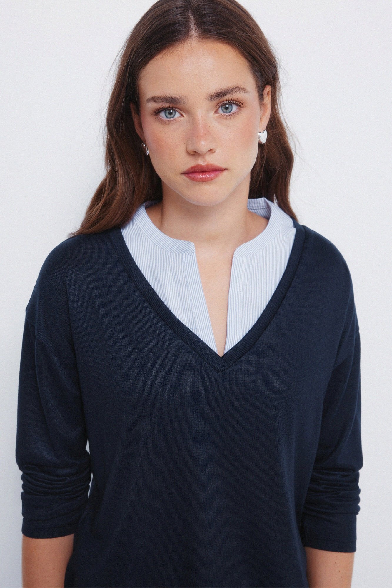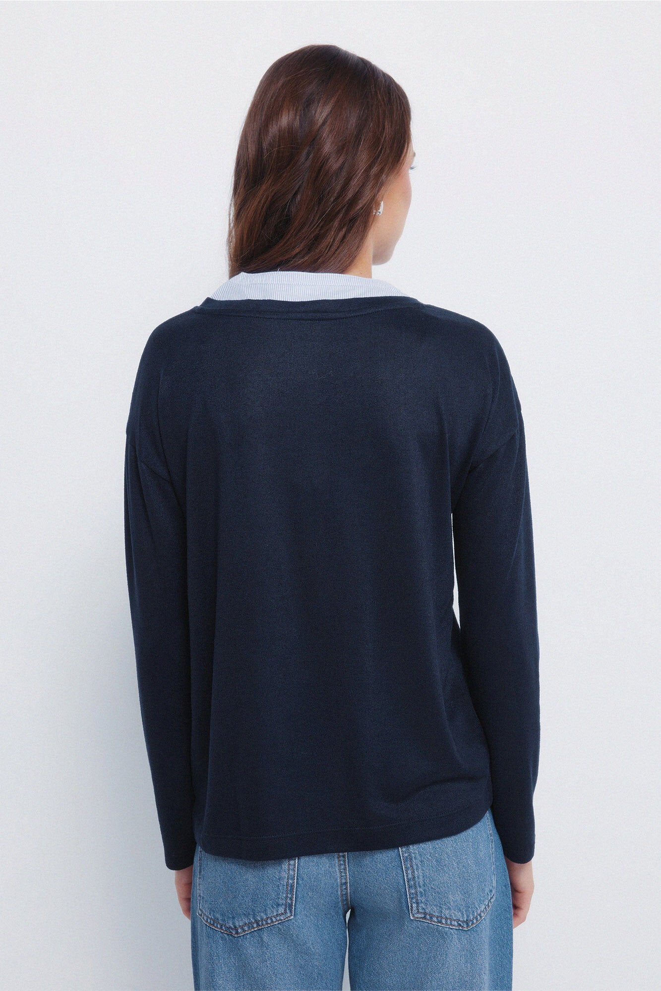 • Camiseta de manga larga con cuello redondo y escote en pico