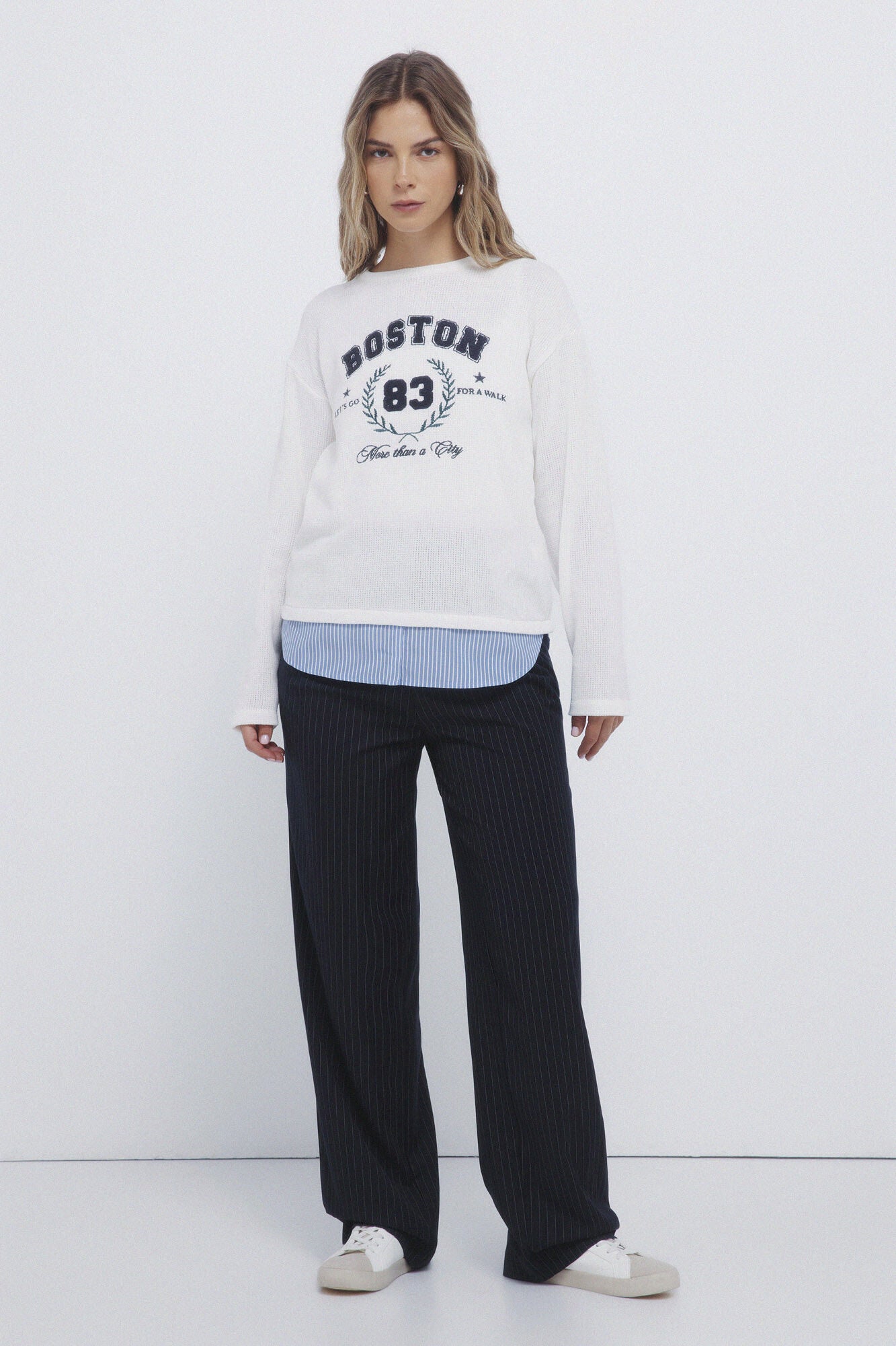 • Sudadera fino recto de manga larga caída, con cuello redondo, con texto bordado en el delantero con relieve, con combinación de tejido en el bajo