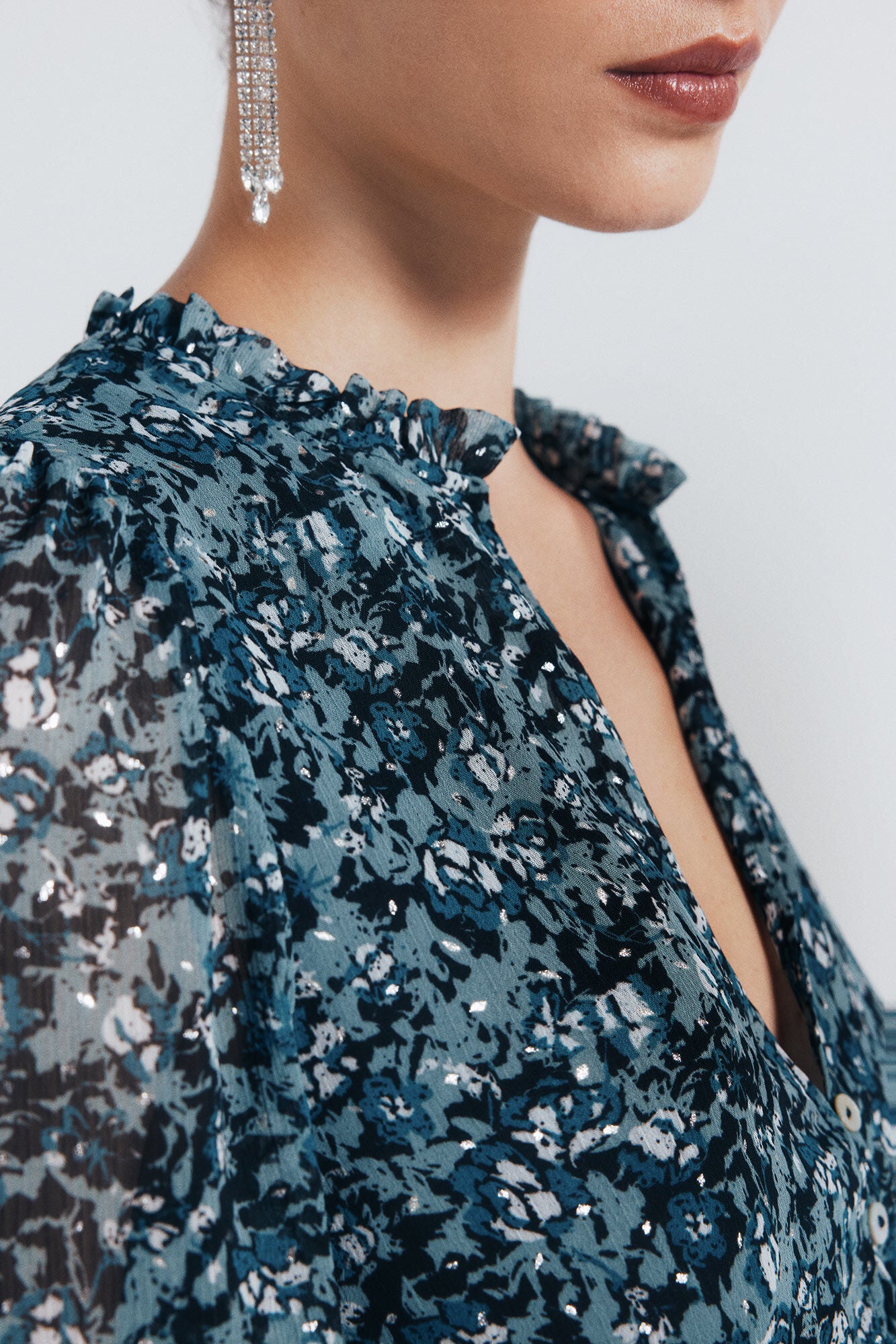 • Vestido corto de manga larga con volumen semitransparente, cuello redondo con escote en v con botones, elástico ancho en la cintura y elástico en los puños, falda con vuelo con volante en el dobladillo, de gasa con estampado