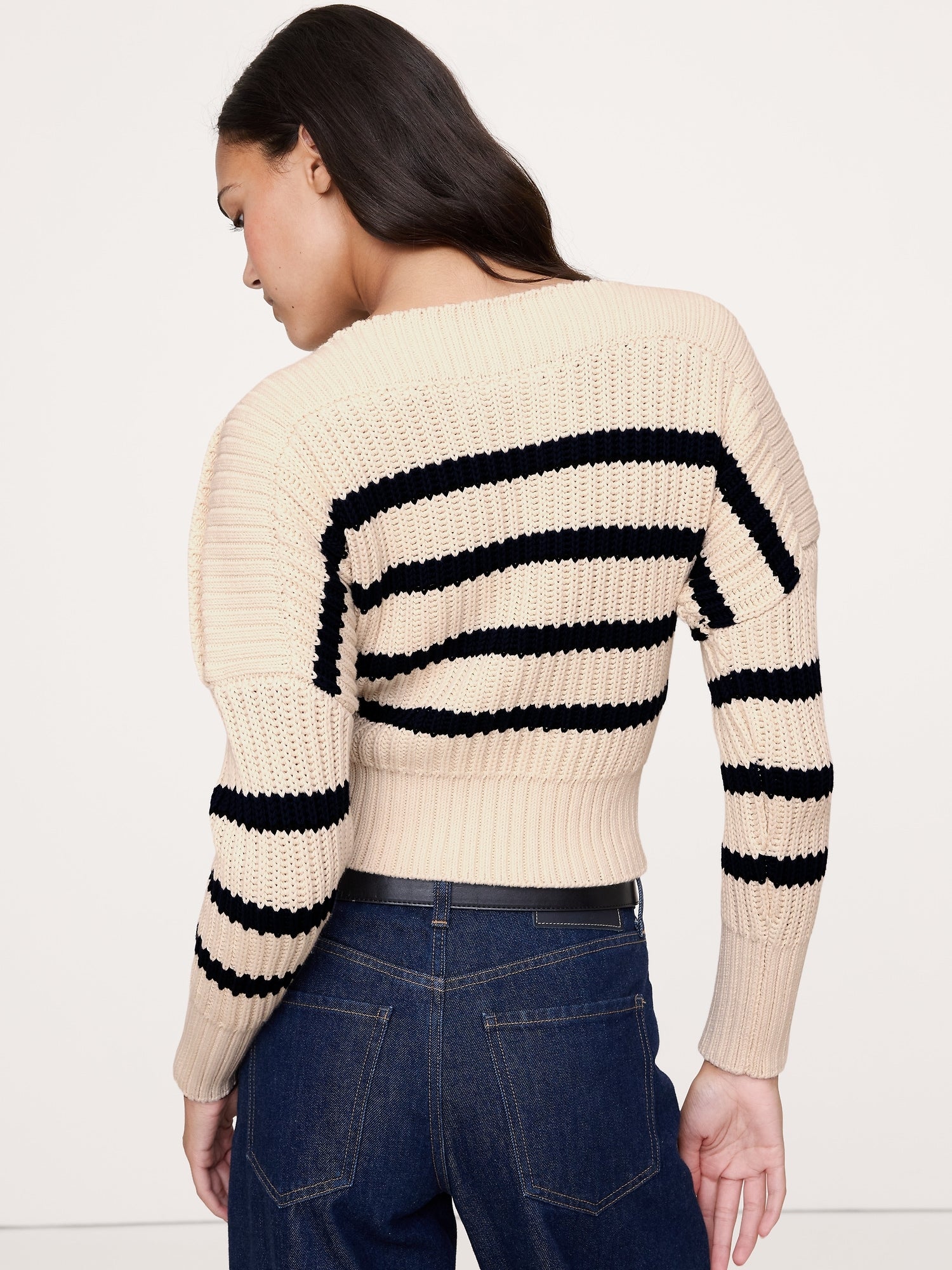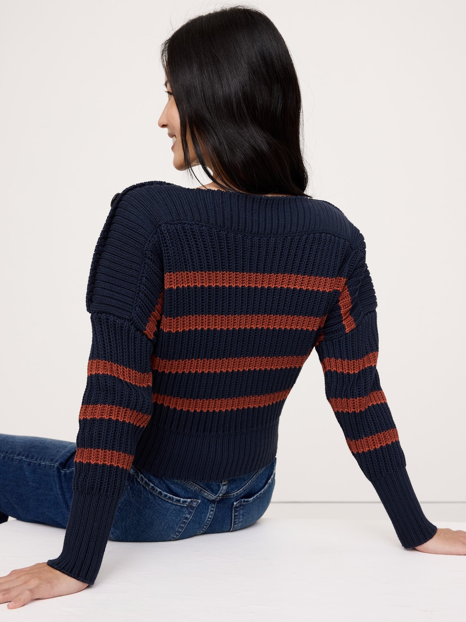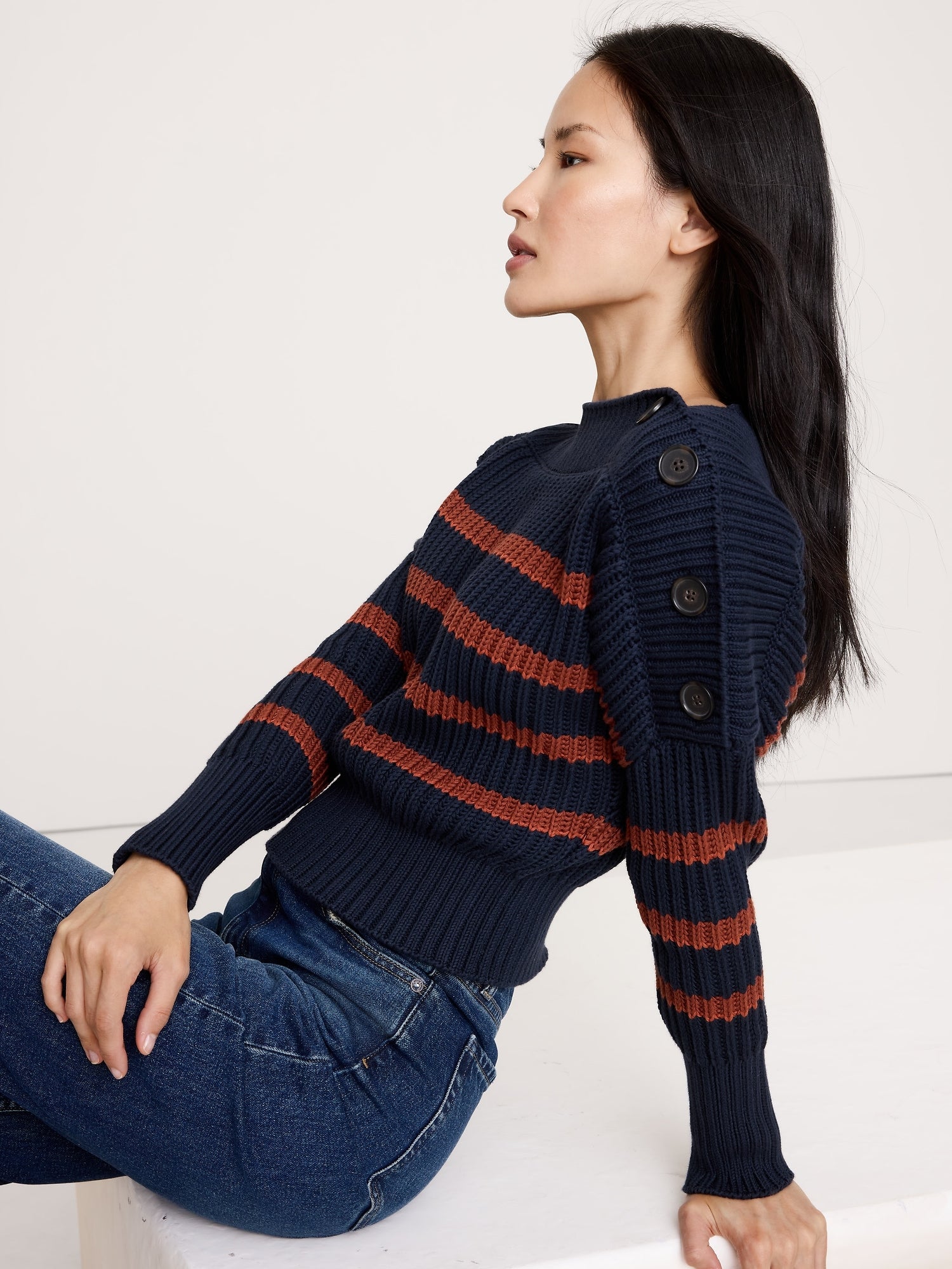 • Nos encanta un suéter con cuello barco. En este caso, tomamos prestado el detalle del botón en el hombro de un suéter vintage y lo recreamos en uno de nuestros hilos de algodón orgánico favoritos, uno que nos encanta por su suavidad y peso para todas las estaciones