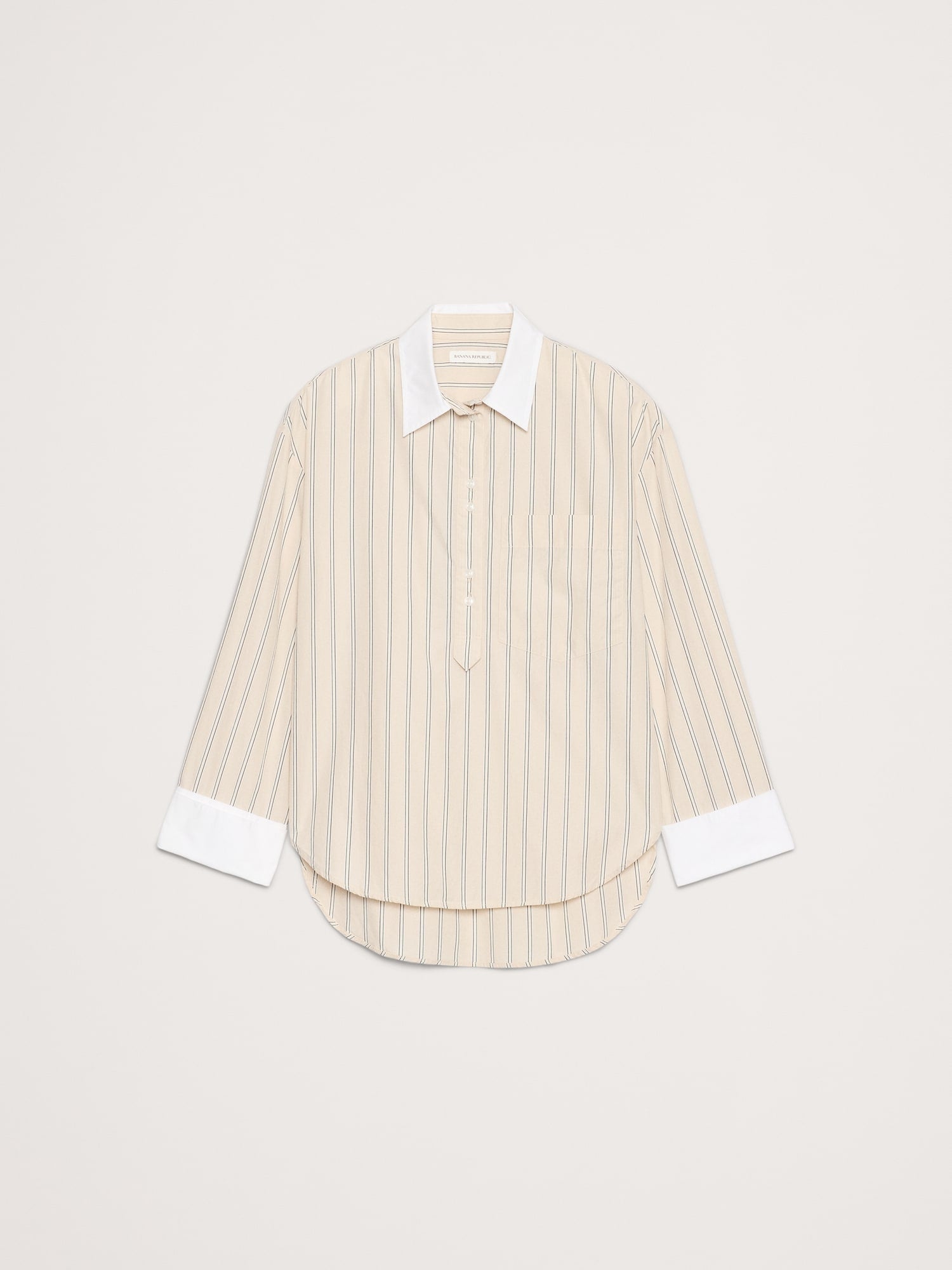 • También conocida como camisa de "cuello bancario", reinventamos esta silueta clásica con su distintivo cuello y puños en contraste como una túnica de gran tamaño, en nuestra distintiva popelina 100 % algodón