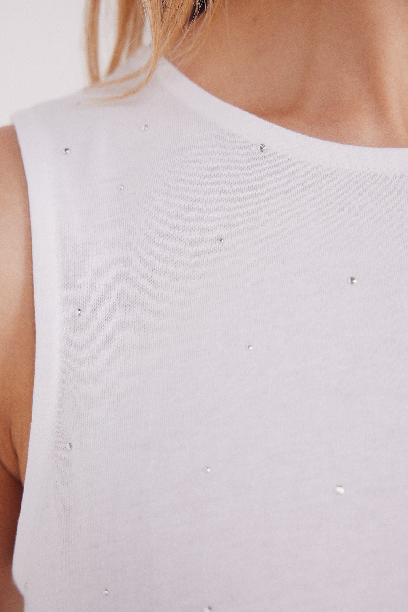 • Camiseta lisa sin mangas con cuello redondo, detalle de tachuelas de cristal en el delantero