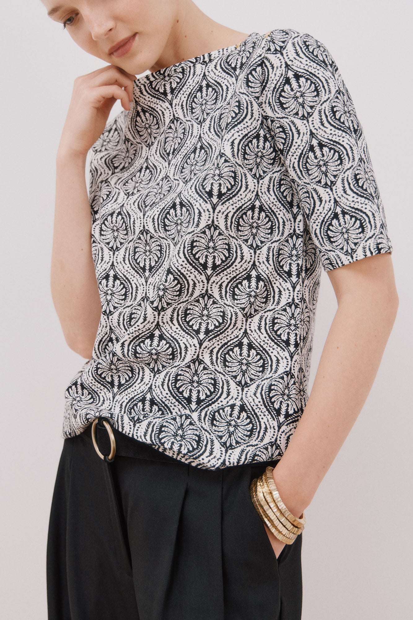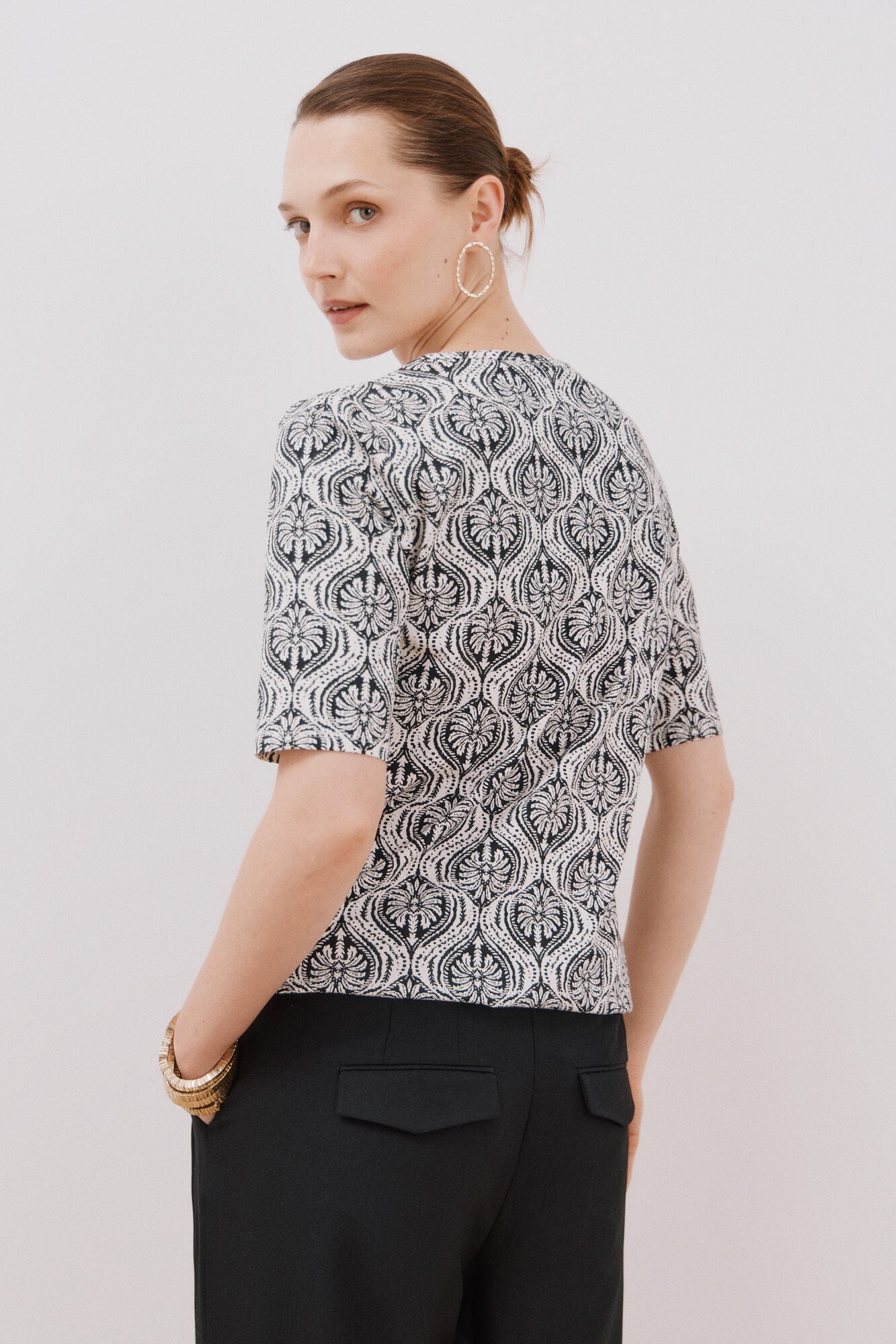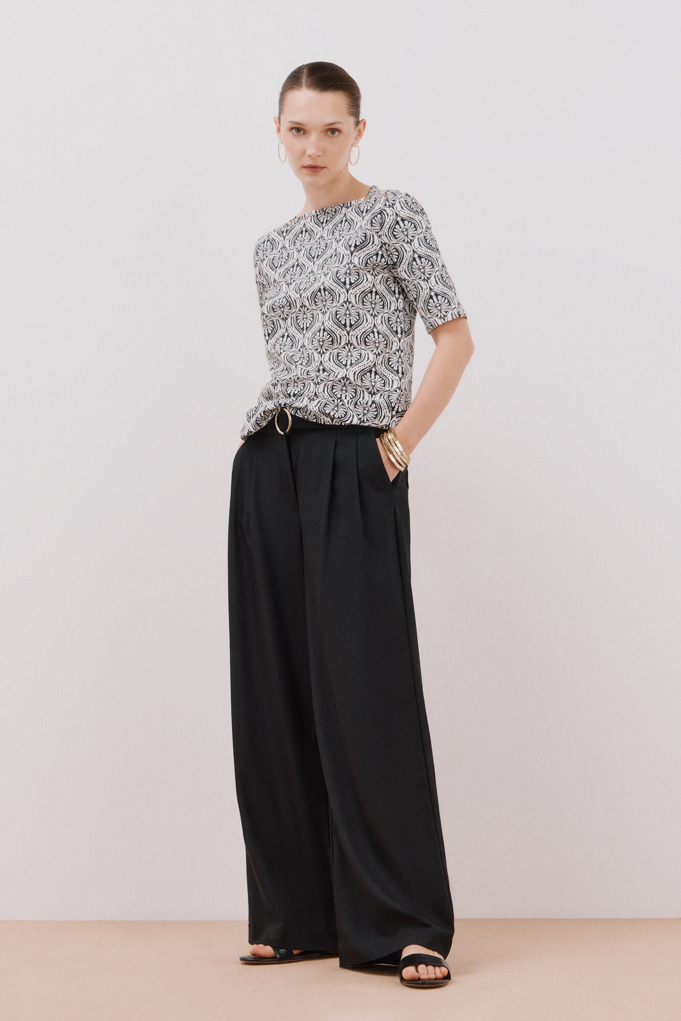 • Escote barco con botones metálicos dorados en hombro