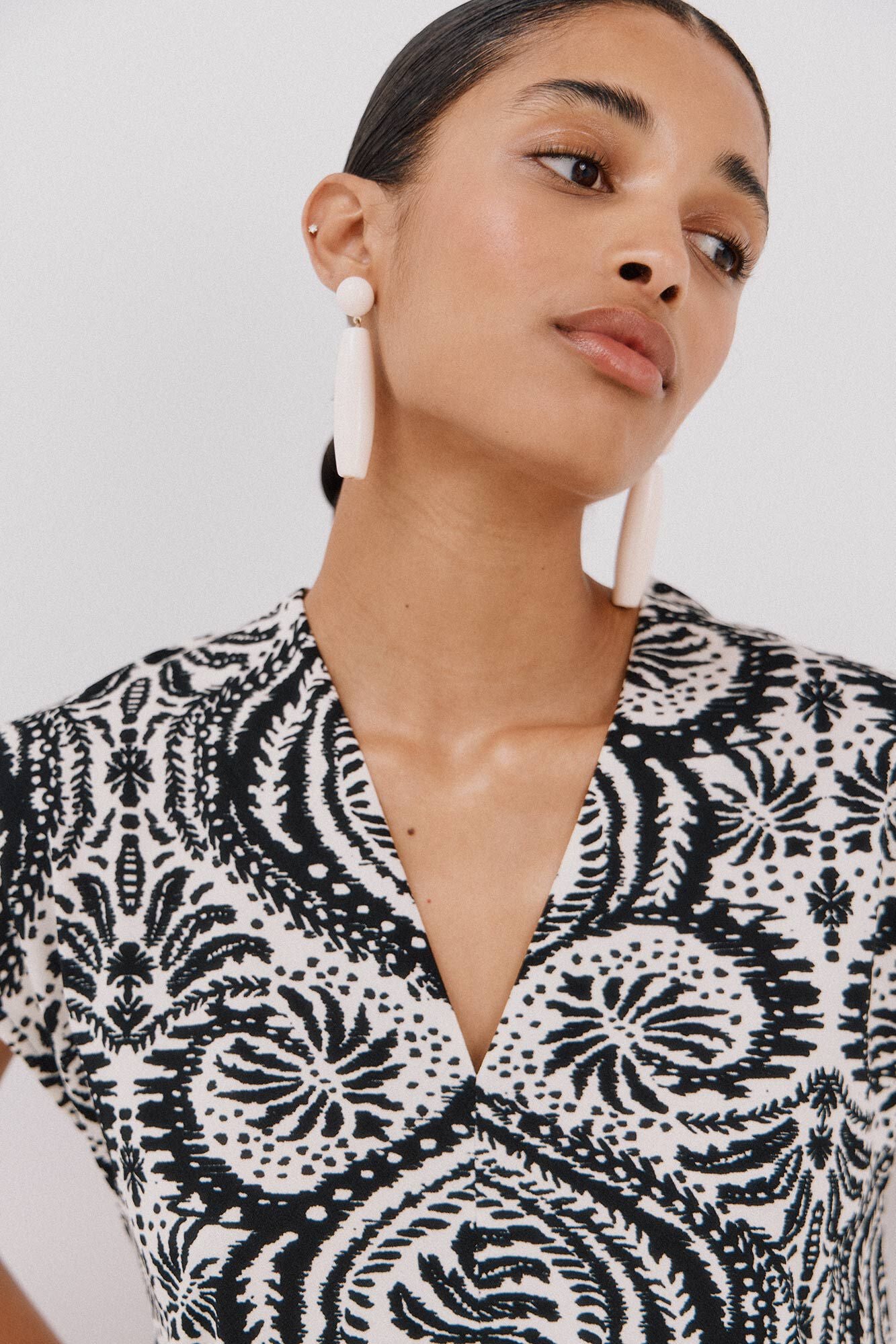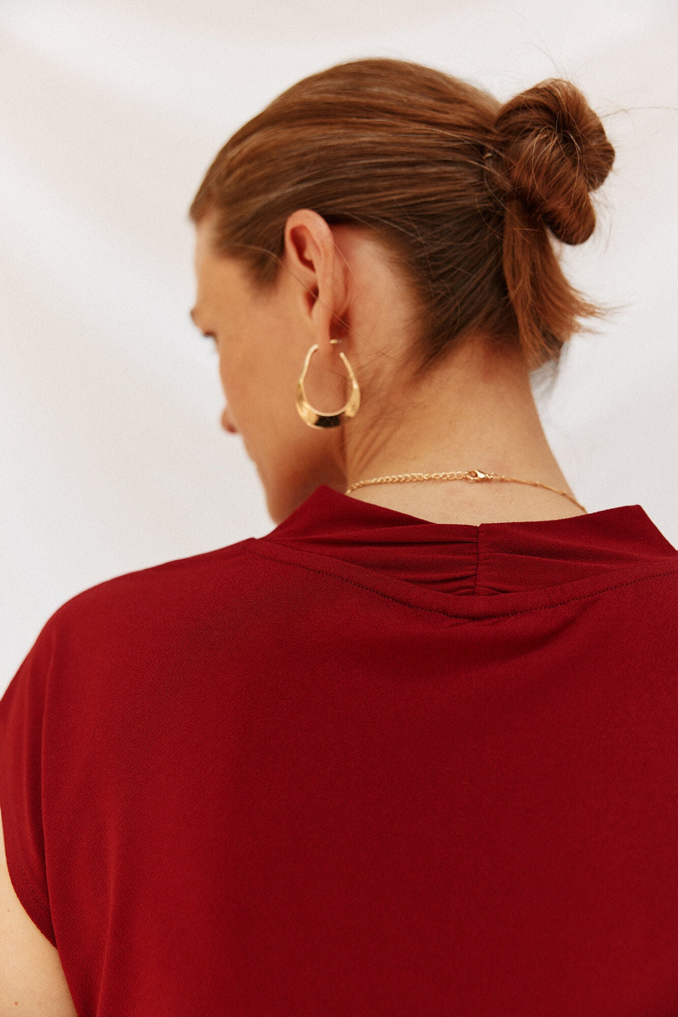 • Escote pico con detalle de frunce en espalda