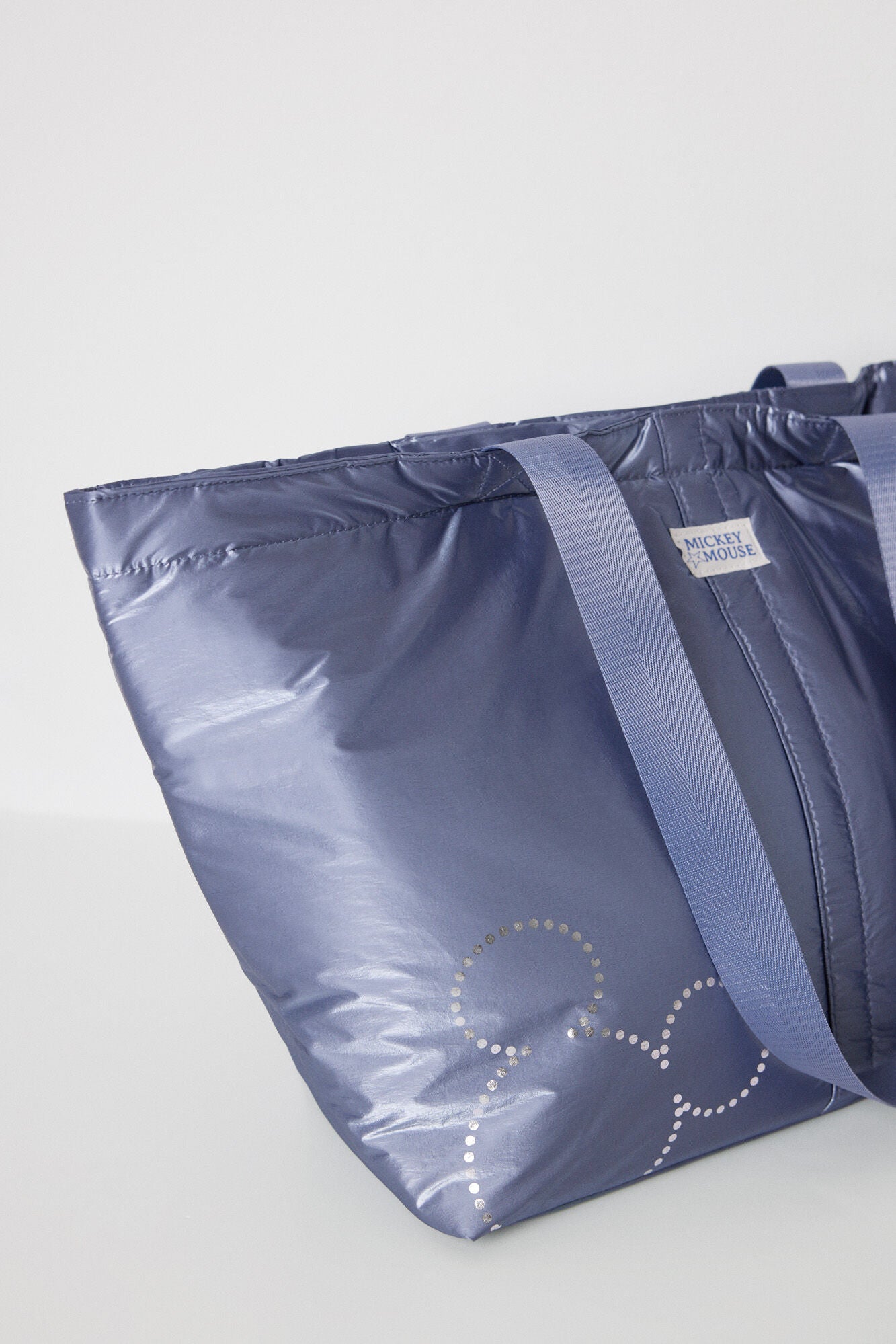 • Bolso grande de nylon brillante en color azul y detalles de Mickey Mouse