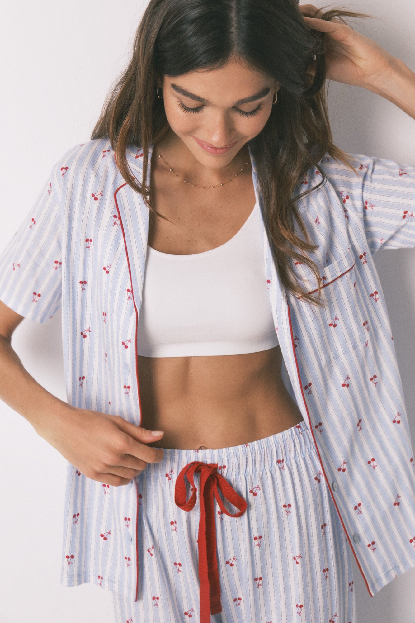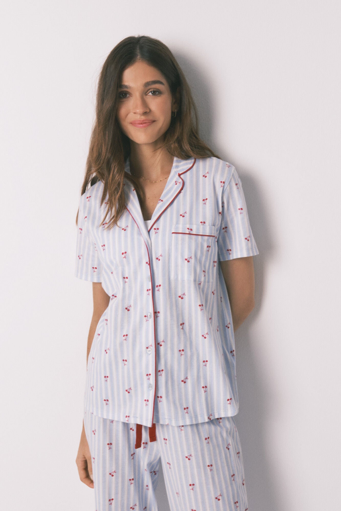• Pijama camisero 100% algodón, de manga corta y pantalón largo con estampado allover rayas y motivos de cerezas