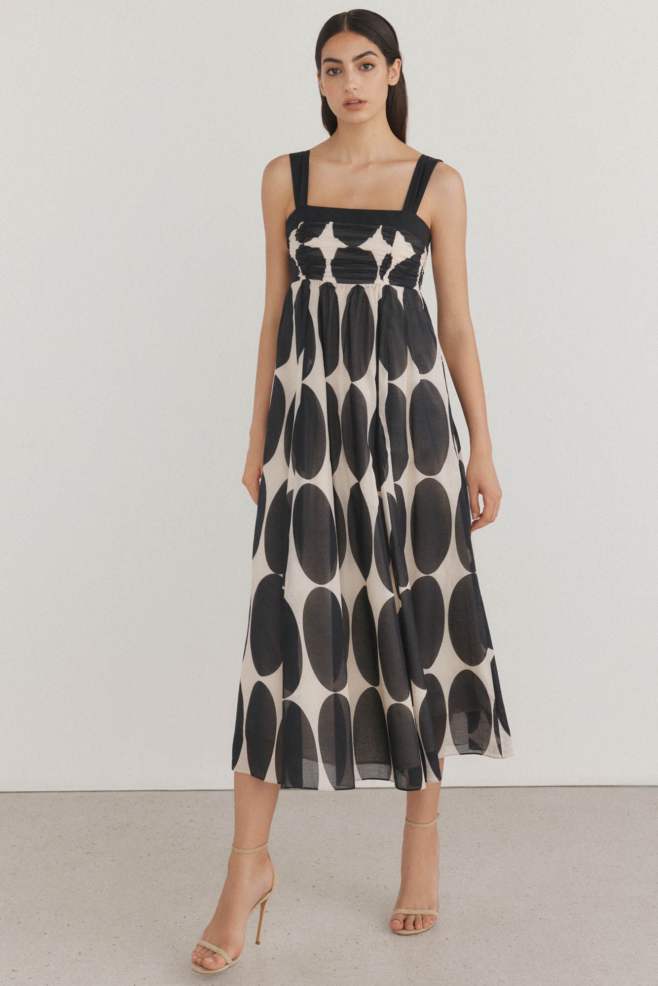 - Vestido escote cuadrado con detalle drapeado, tirantes a contraste en negro con detalle de cinta en espalda