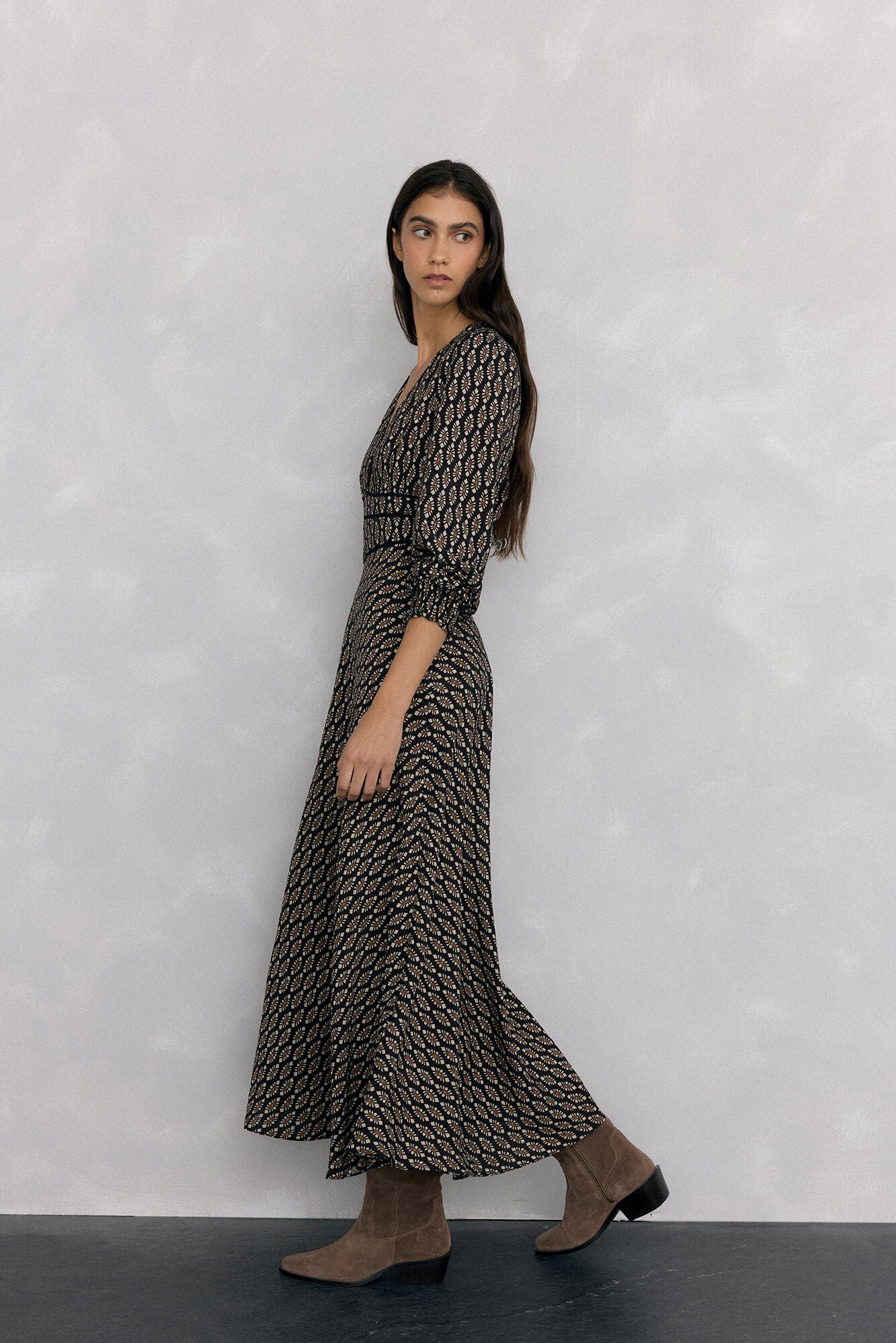 - Vestido midi de escote pico con detalle en hombros de vivos a contraste
