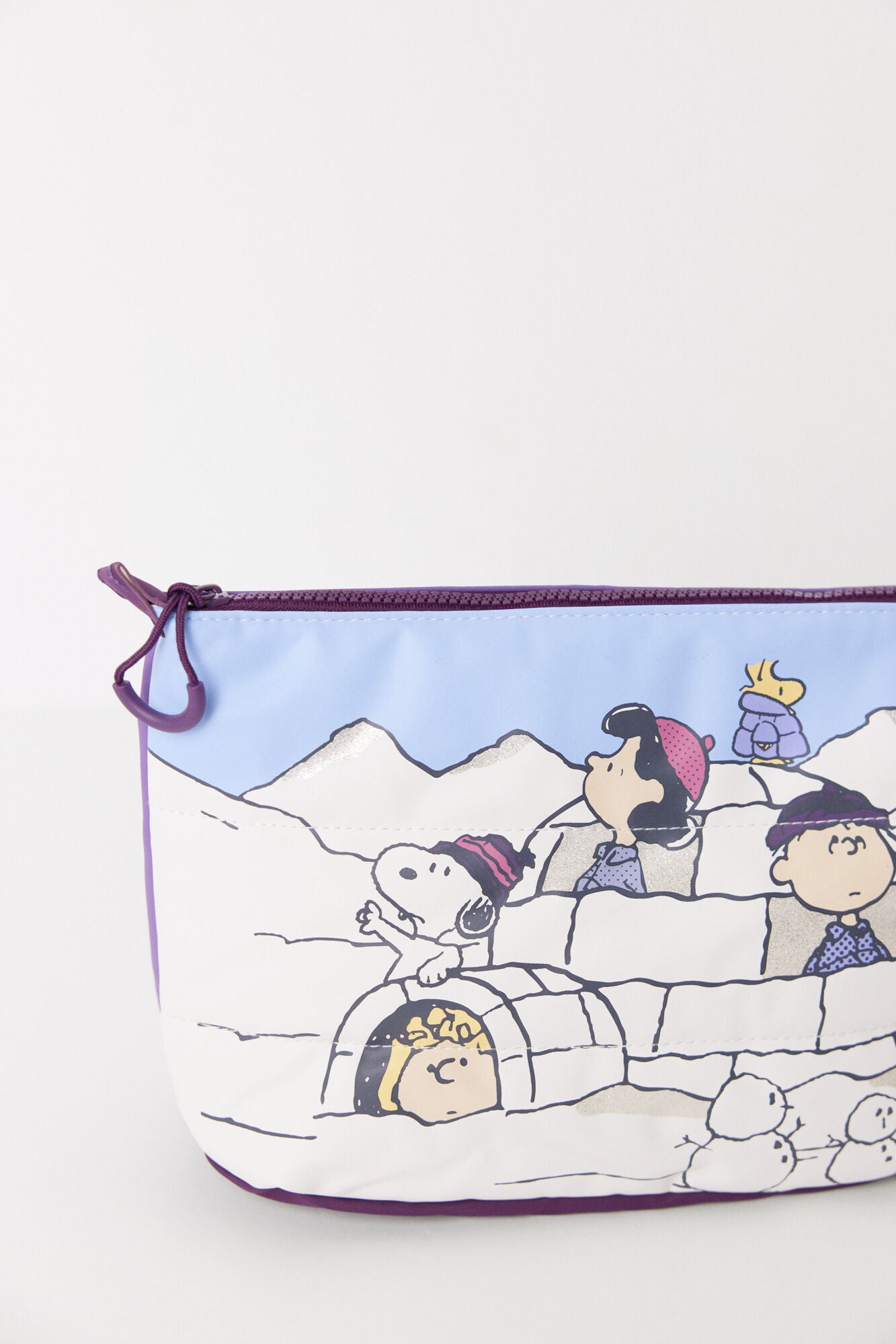 • Neceser grande, en forma rectangular, con estampado de Snoopy en tonos morados y cierre de cremallera