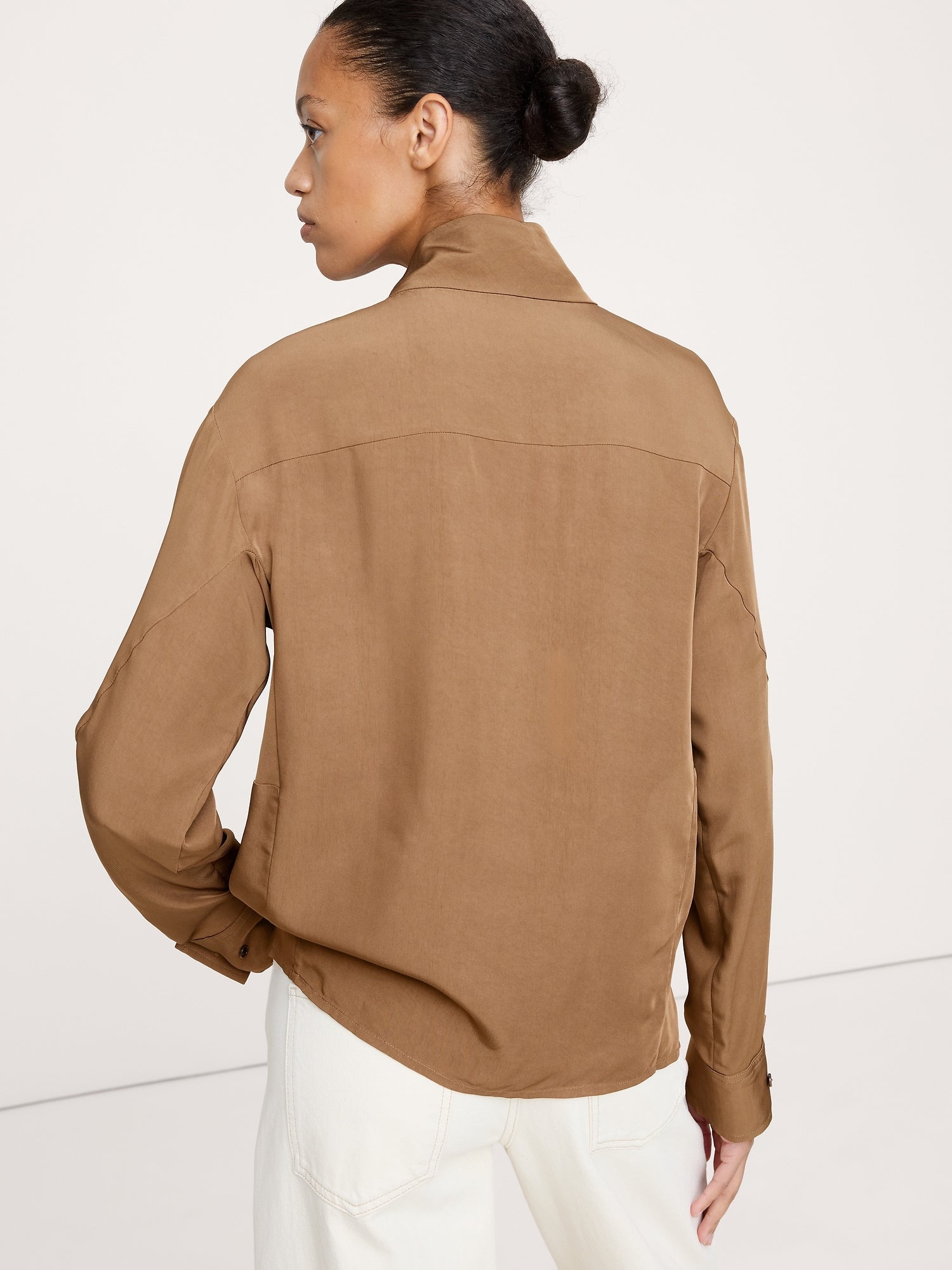 • Una camisa clásica con botones y un toque especial. Desplazamos la tapeta de botones y optamos por un cuello alto: déjalo abotonado hasta arriba o desabrochamos algunos para lograr un escote asimétrico. Corta nuestra sarga drapeada para que quede un poco más elegante