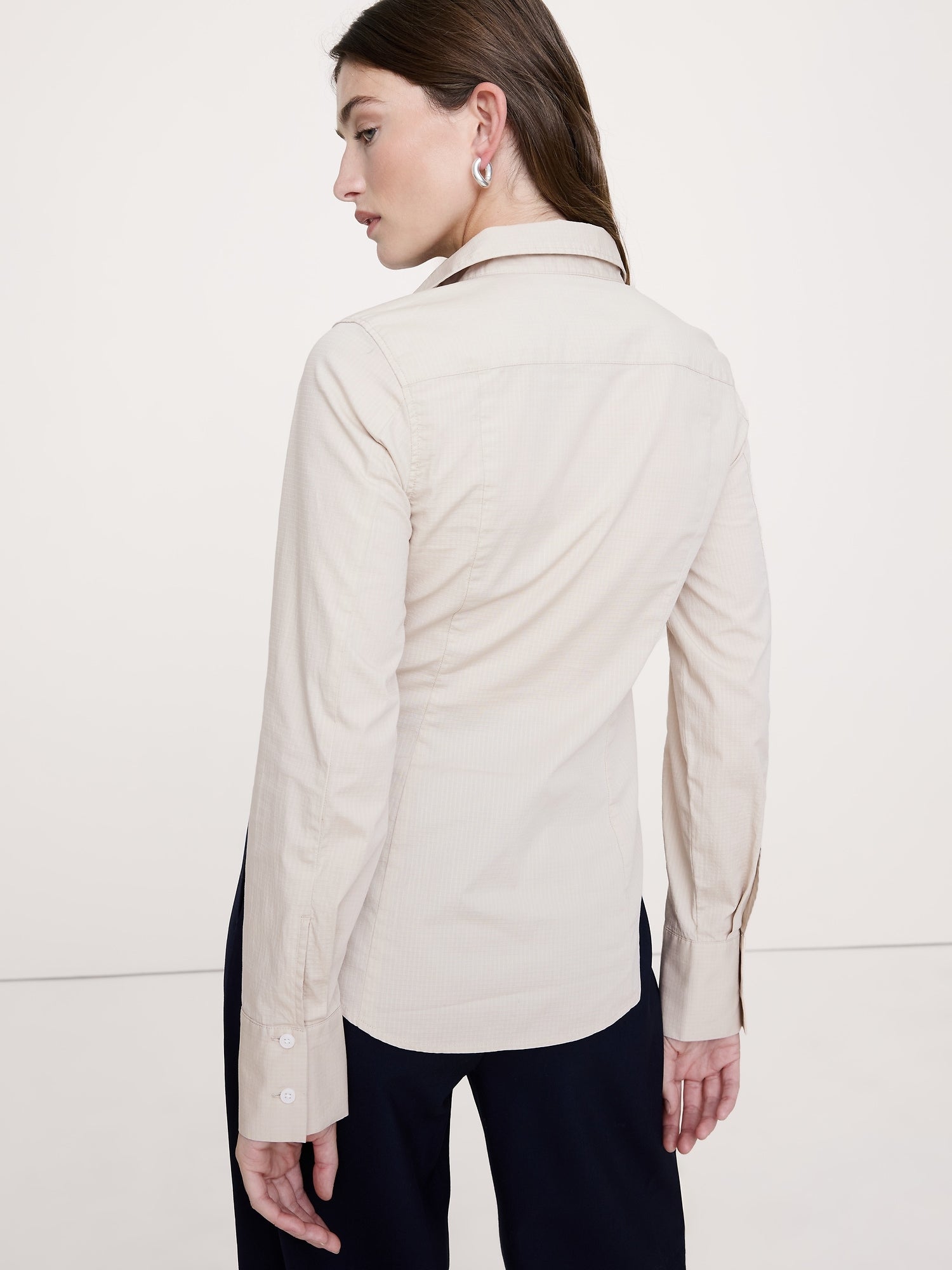 - Nos encanta nuestra tela ripstop de algodón elástico con su característica textura de cuadrícula. Aquí, lo usamos para yuxtaponer la construcción de paneles tipo corsé de esta camisa con corte de reloj de arena.