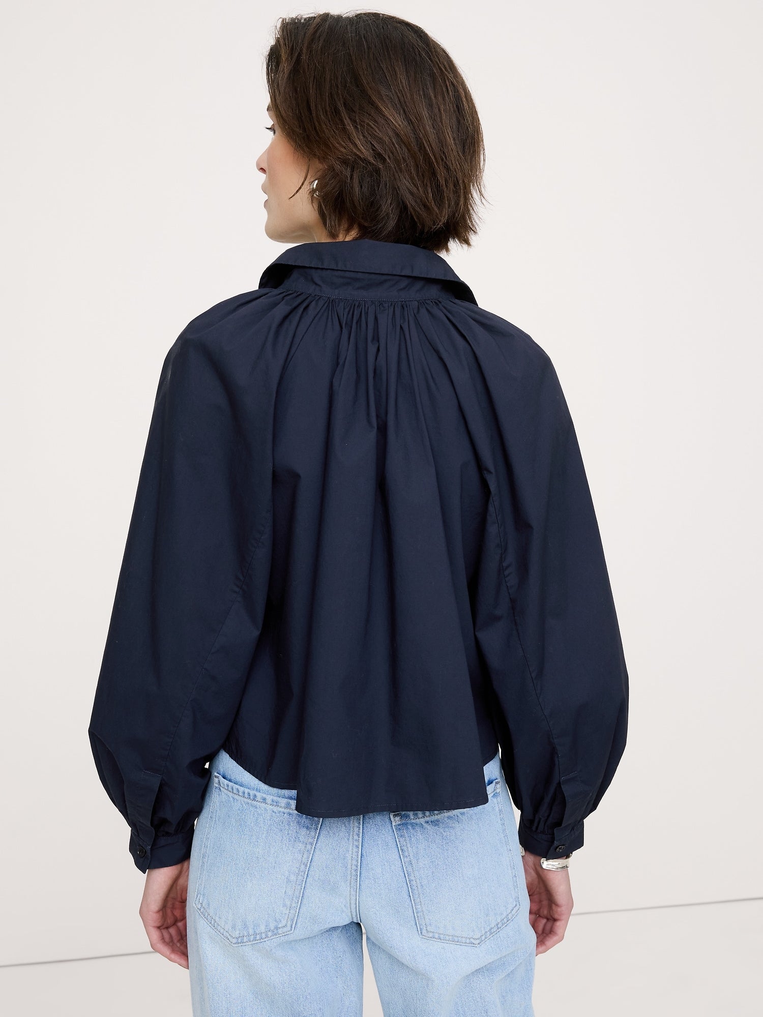 - Nos encanta la popelina de algodón ahora (y siempre). Este top hace un guiño a la tendencia de mangas voluminosas de la temporada, presenta un estilo camisero y un fruncido que se frunce en el cuello