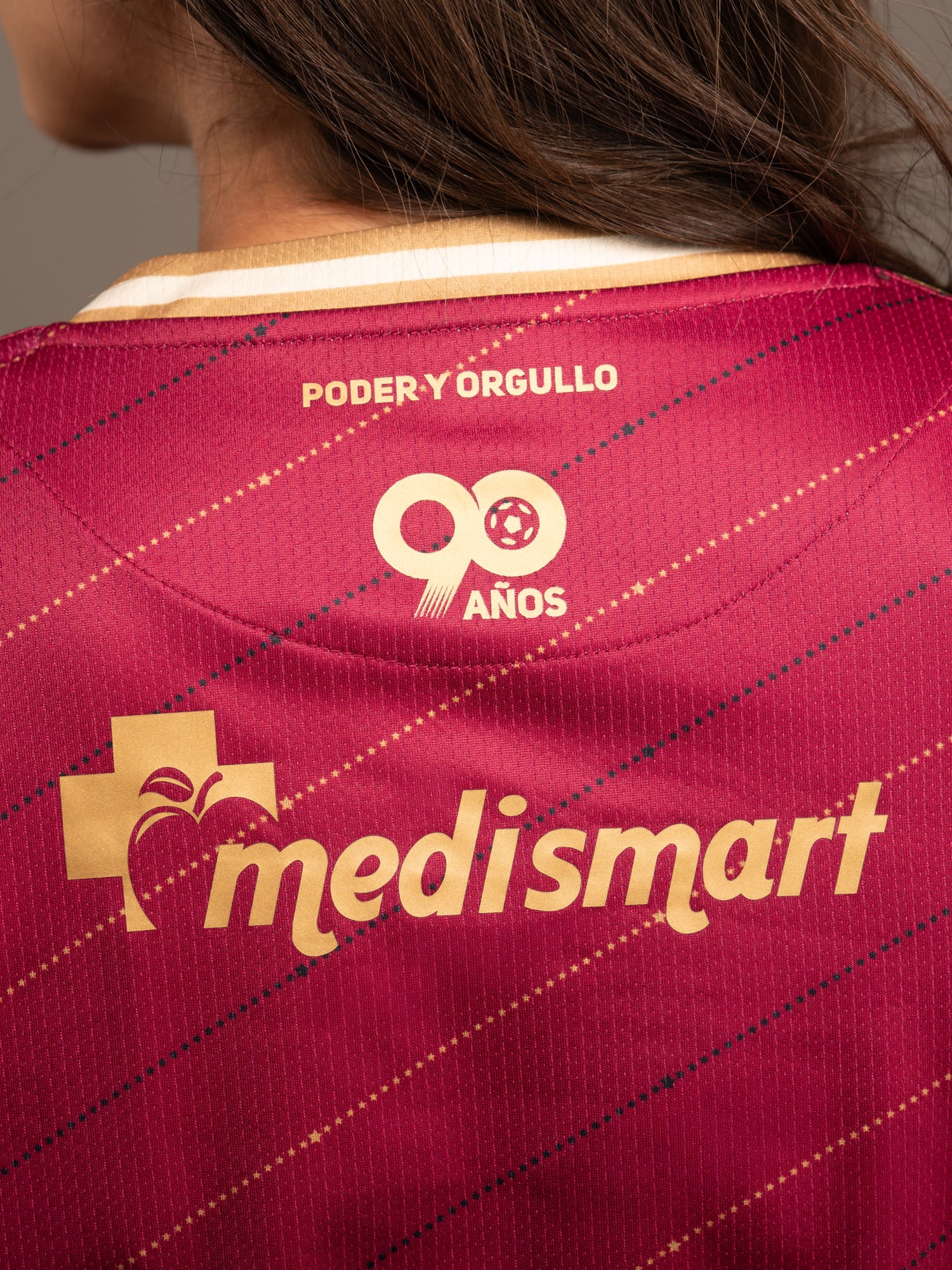 Esta camiseta es “Poder y Orgullo”. Una frase originada a finales de los 80s, junto a este emblemático escudo, que resume perfectamente nuestros 90 años de gloria. Miramos hacia atrás y cada parte de nuestra historia está bañada en oro y coronada con estrellas. Por eso, apreciamos líneas de estrellas y detalles en dorado por toda la camiseta.