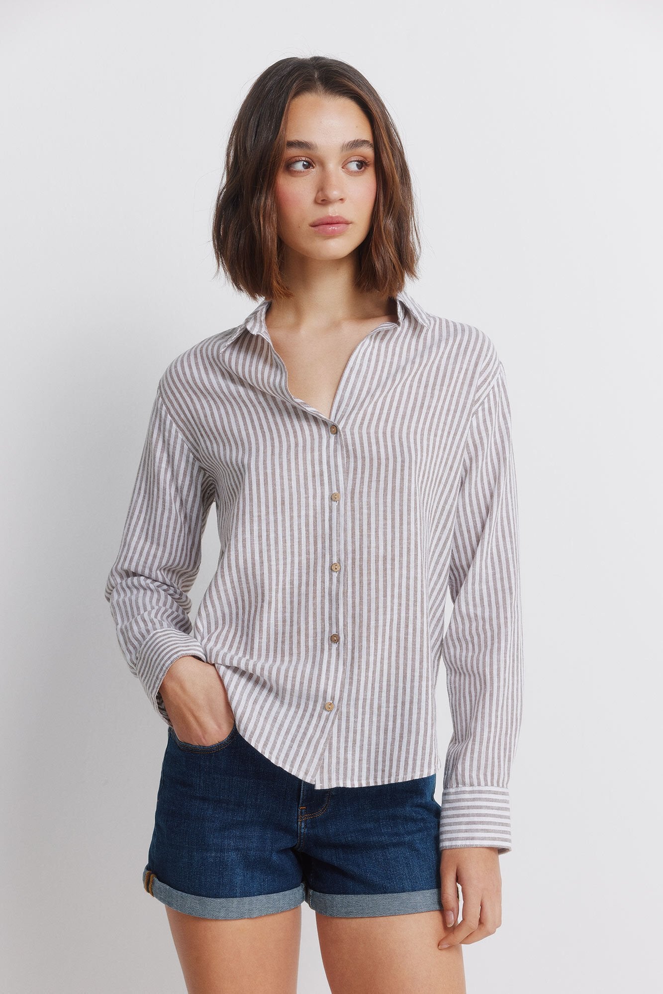 • Camisa semi entallada de manga larga, con cuello camisero y escote en pico, con botones al frente y en los puños