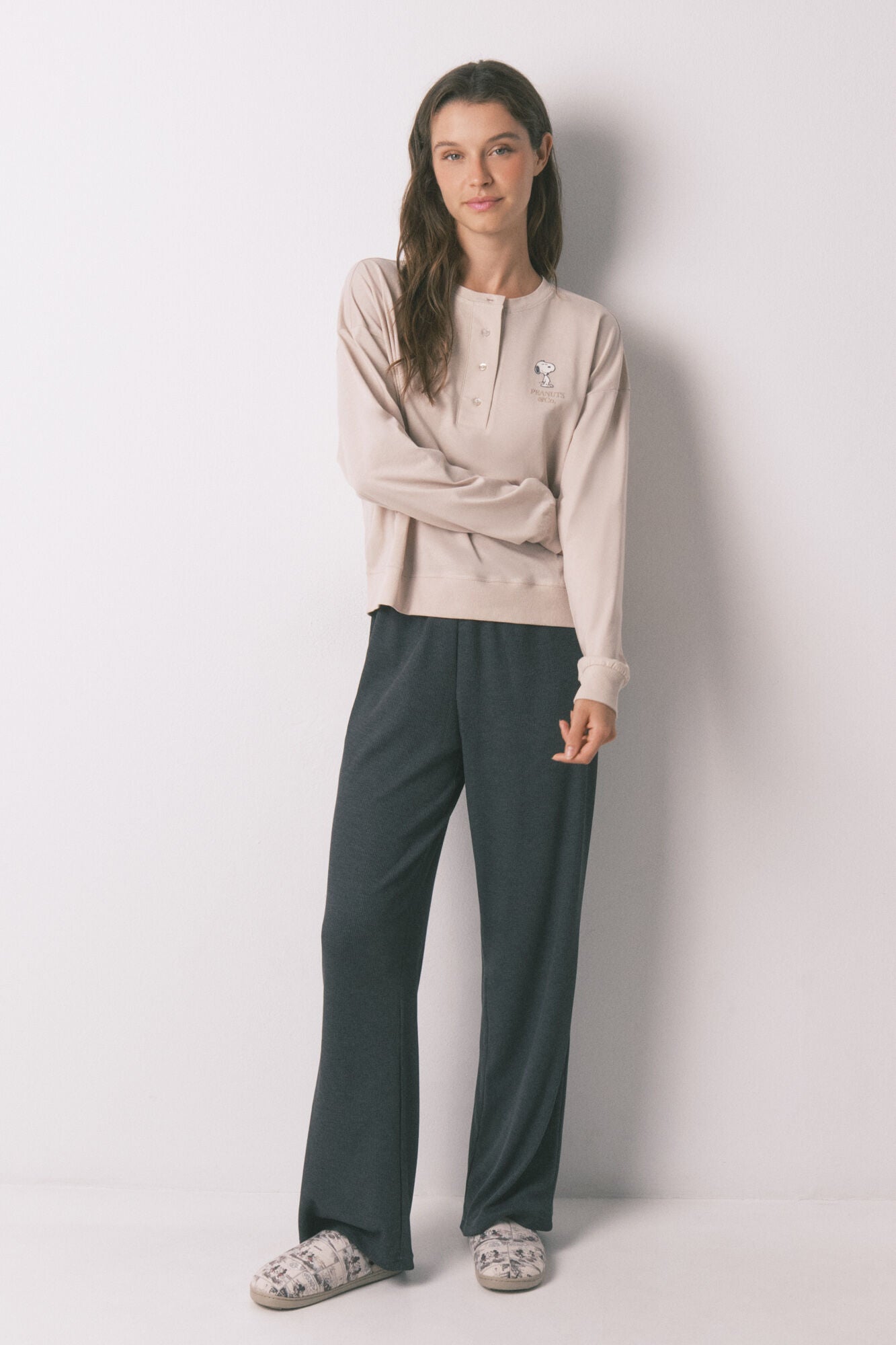 • Pijama largo confeccionado en tejido 100% algodón, con multi estampado de motivos de Snoopy ¡Perfecto para esas noches más fresquitas y para estar en casa súper calentita y con estilo!