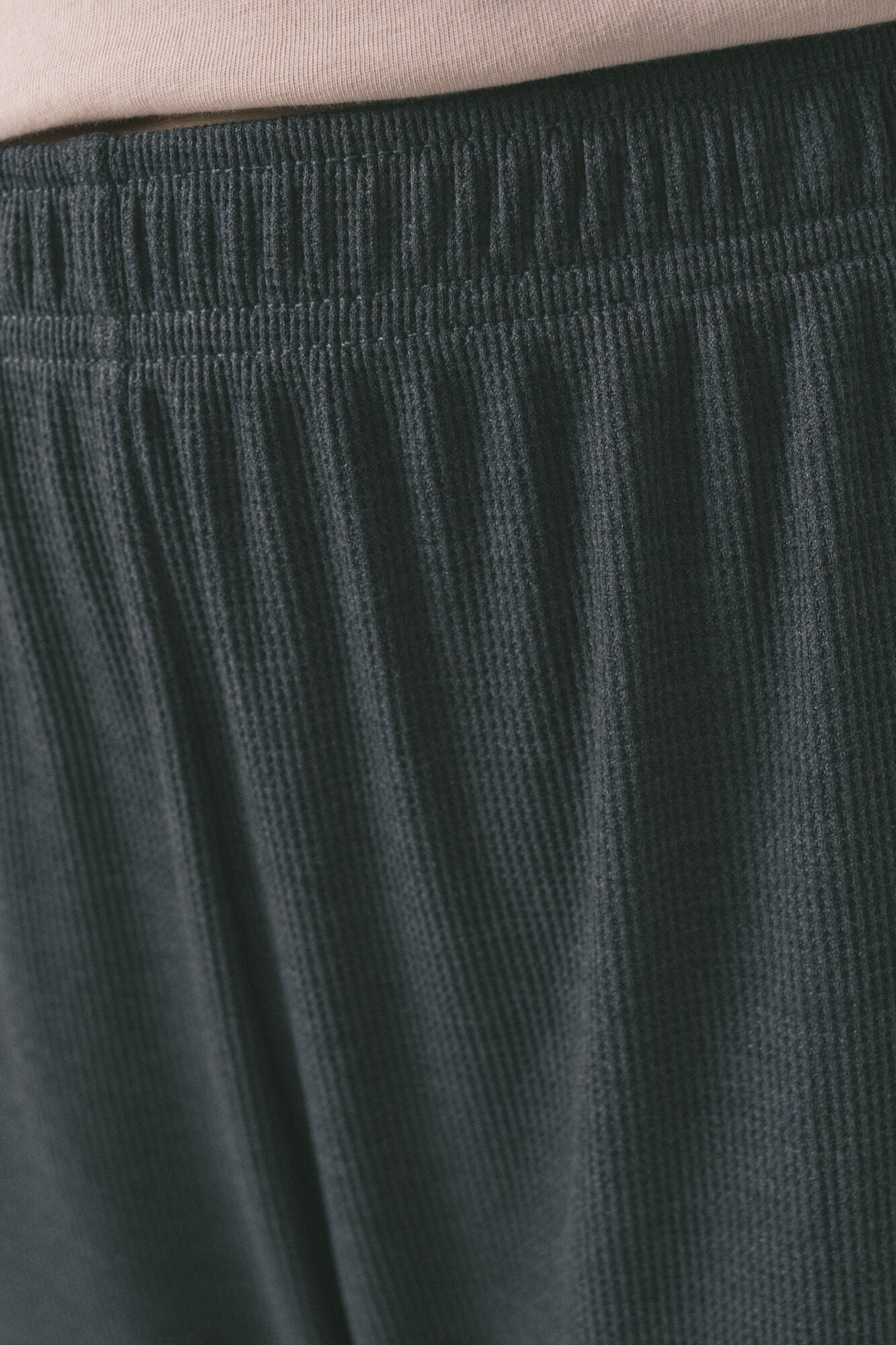 • Pantalón ancho ligeramente acampanado con textura de waffle, cinturilla elástica y etiqueta central
