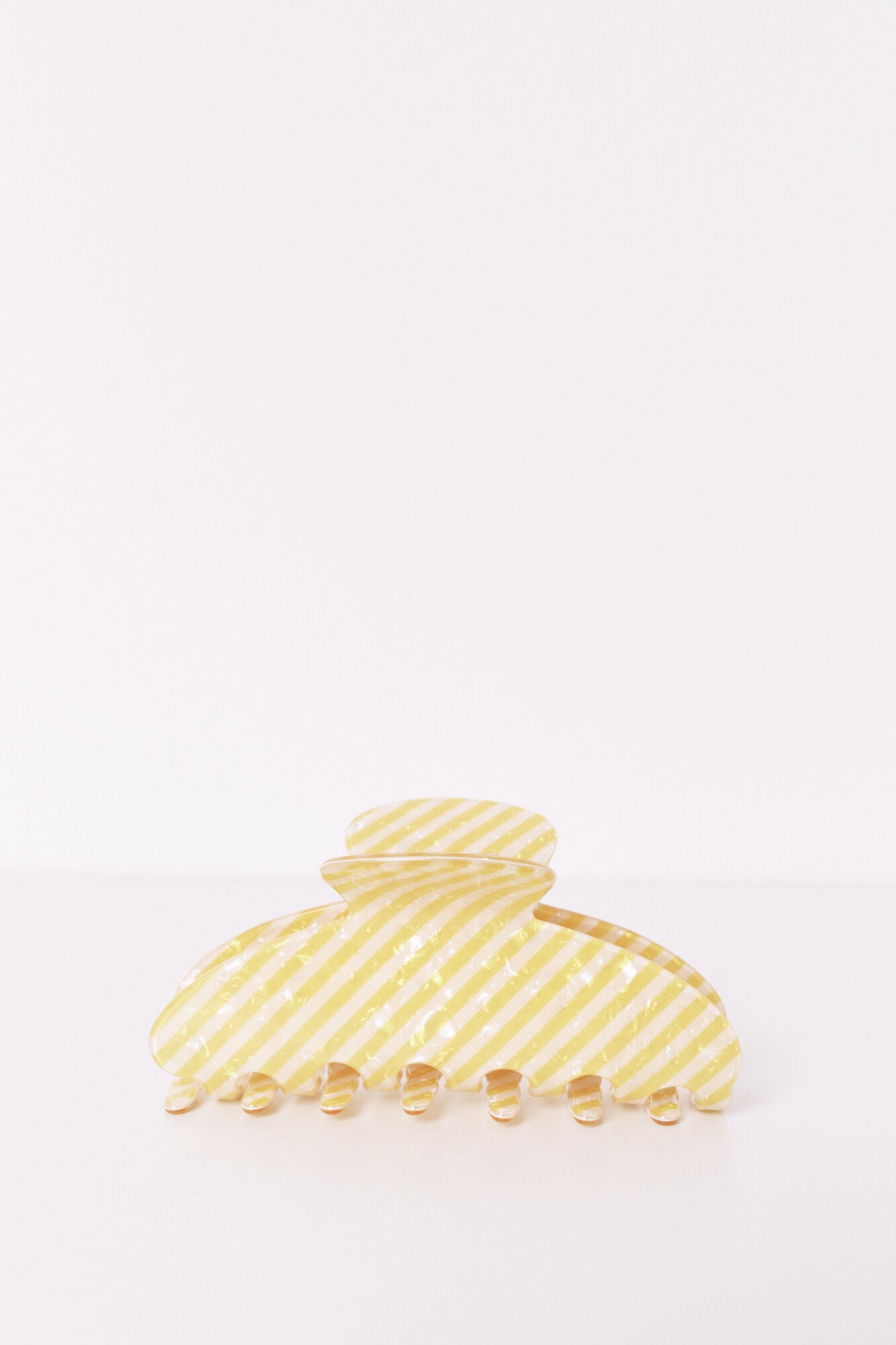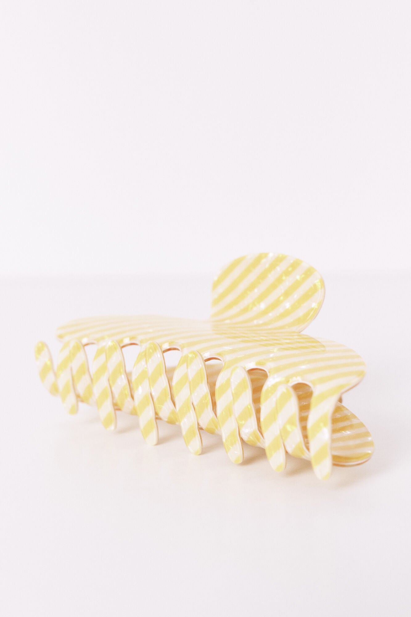 • Pinza en color amarillo y blanco a rayas, ideal para sujetar tu cabello de forma cómoda y estilosa