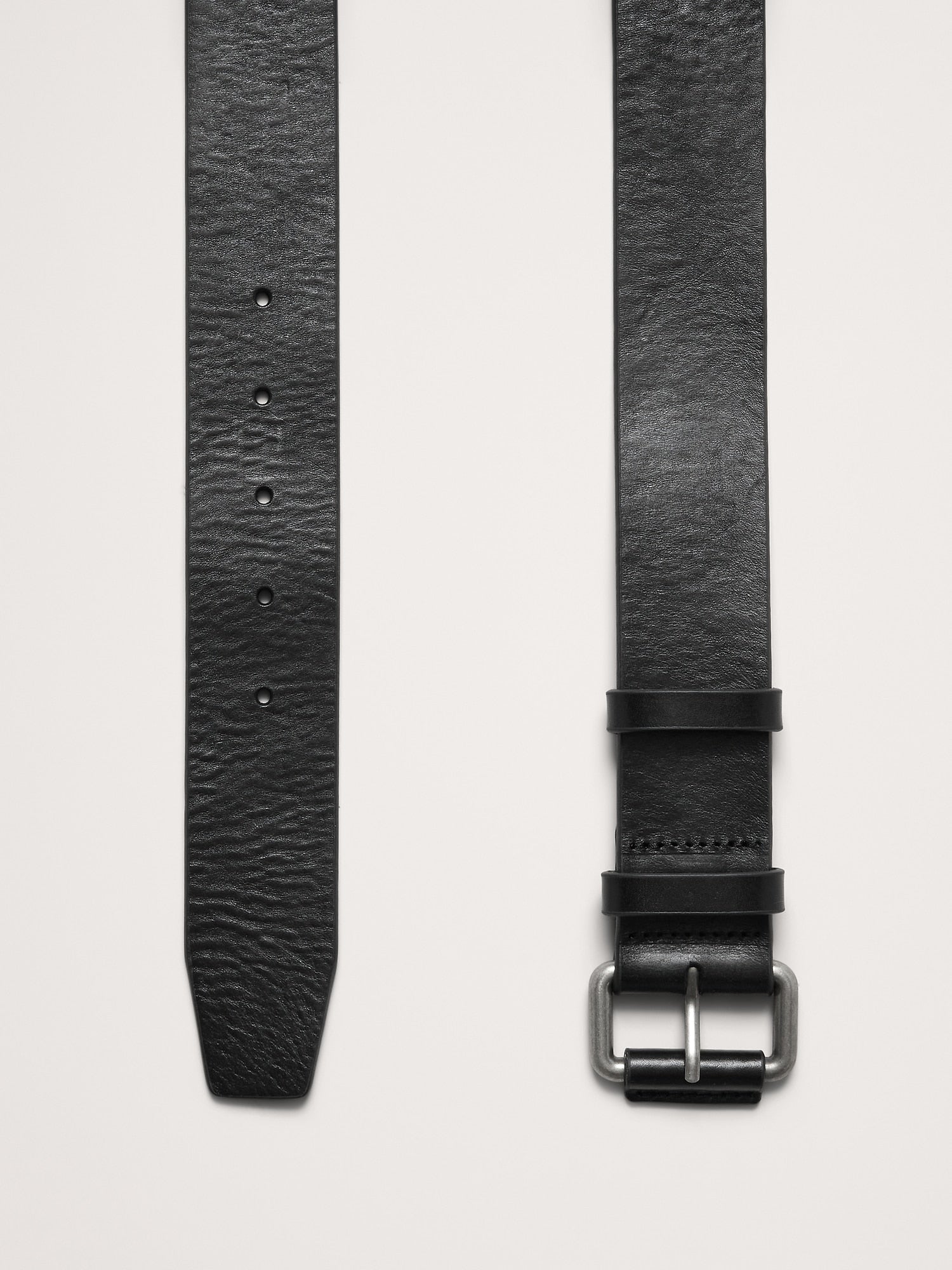 • Un cinturón de cuero resistente y resistente, con un acento de hebilla de rodillo cubierto de cuero
