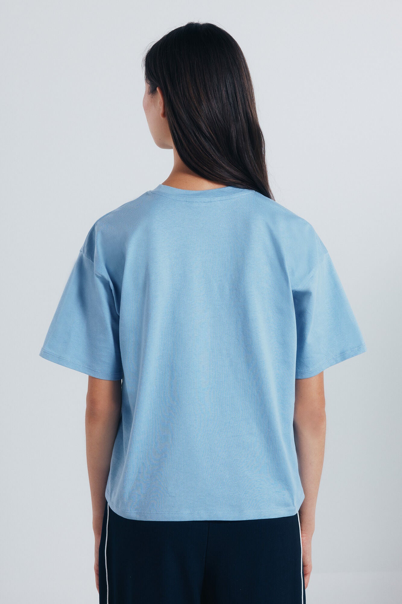 • Con cuello redondo, con estampado gráfico posicional de dibujo y texto en el delantero