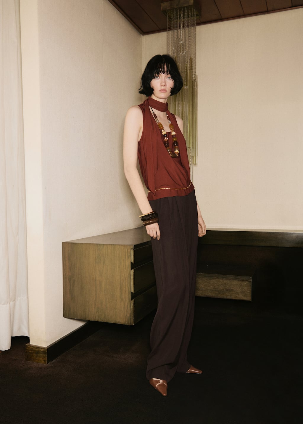 • Con un diseño recto y suave, esta prenda presenta un escote bajo con adorno de pañuelo en el cuello y tirantes anchos