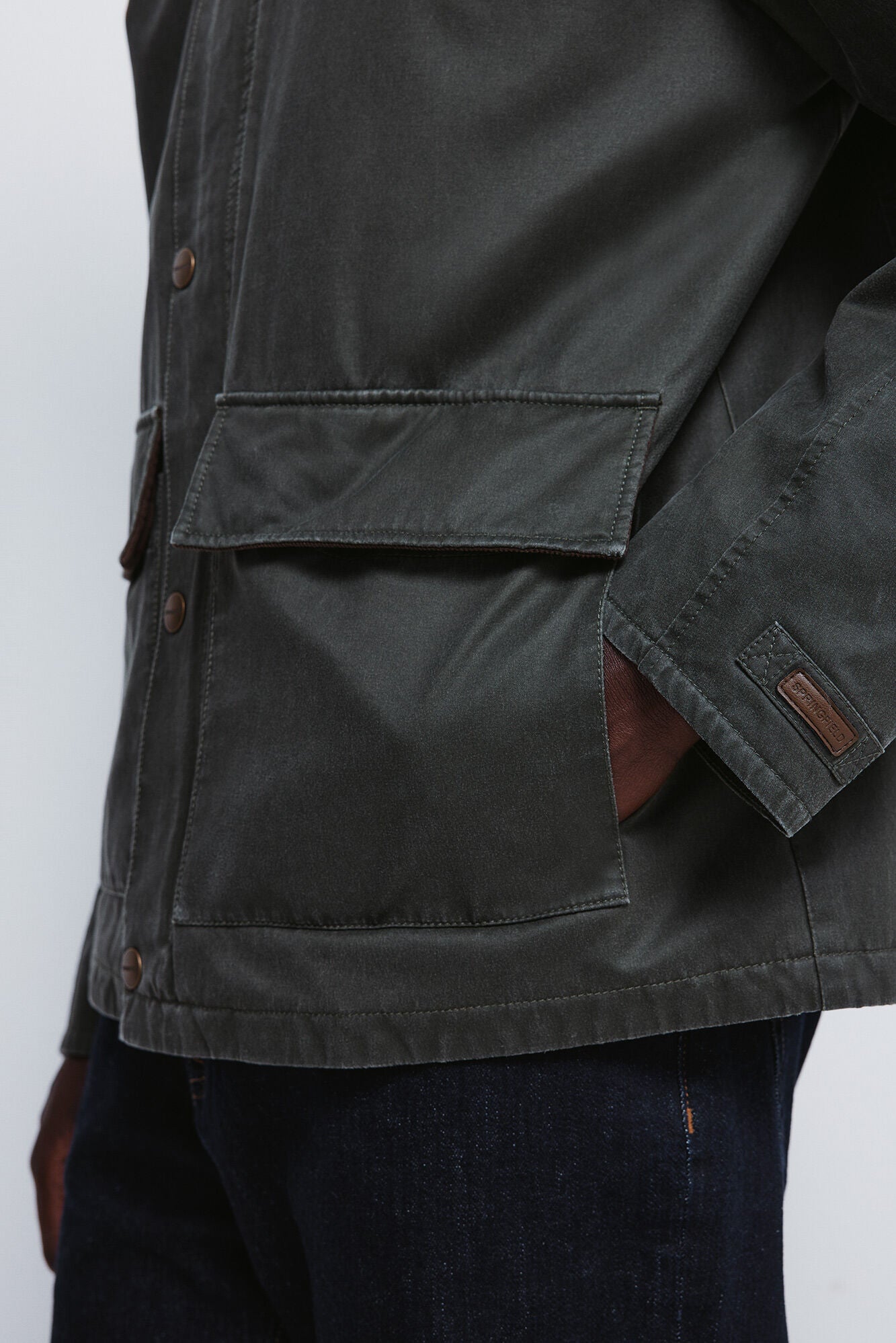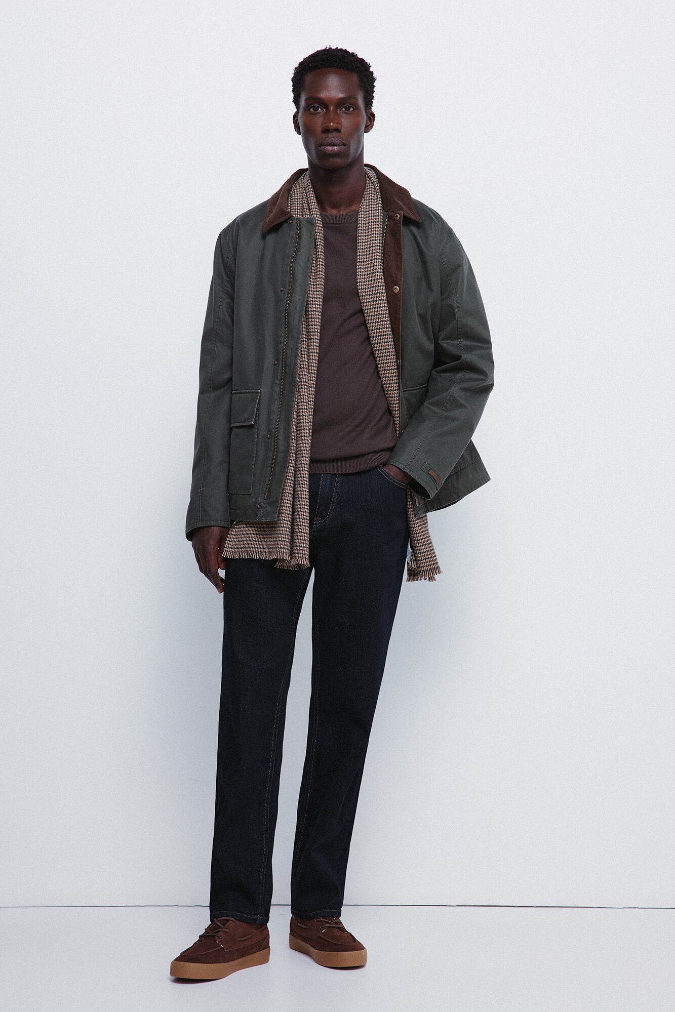 • Chaqueta corta en tejido mezcla de algodón/poliéster encerado y lavado, con ligero acolchado de poliéster reciclado REPREVE y forro de cuadros