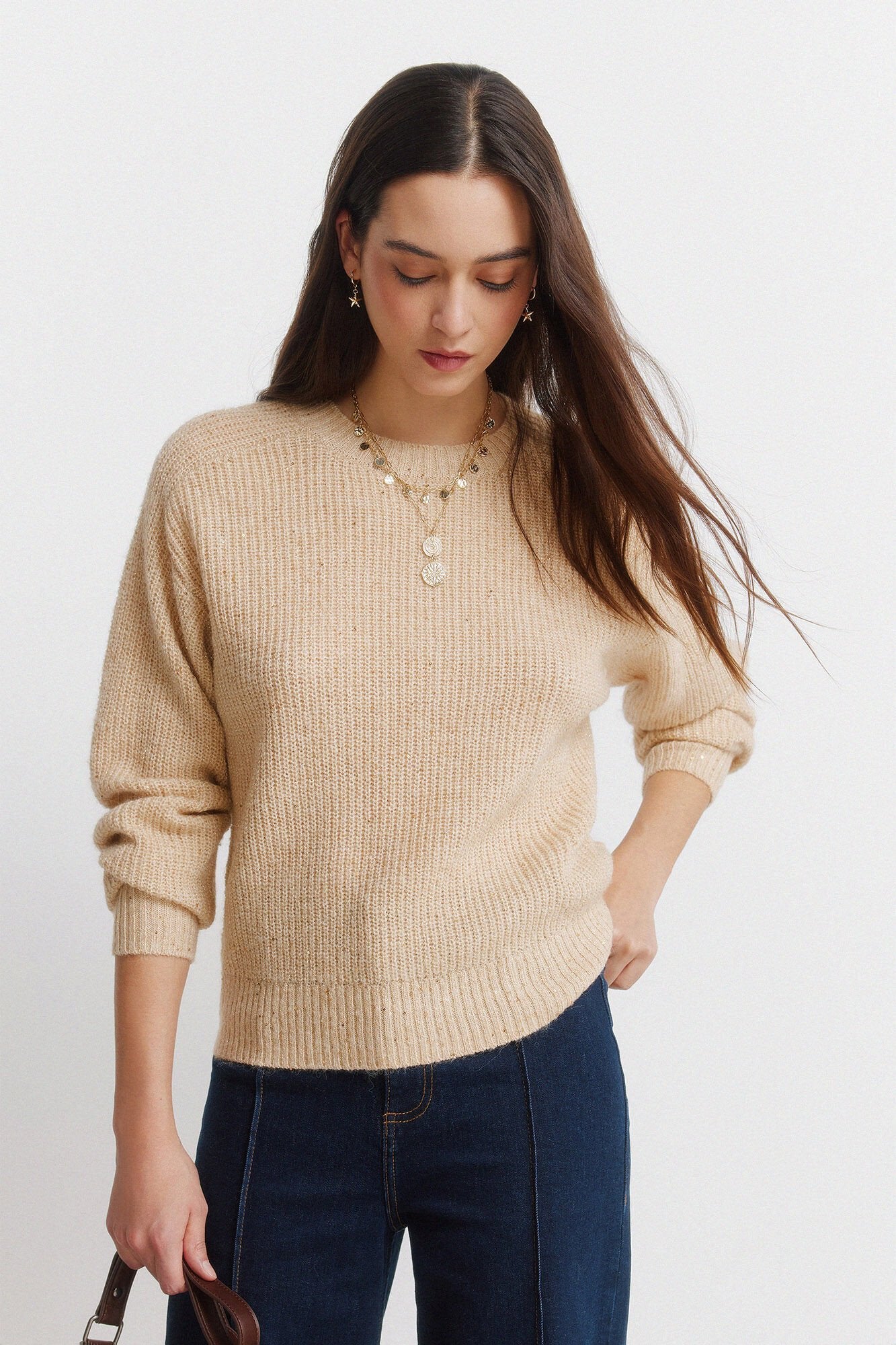 • Sudadera de manga larga con volumen, con cuello redondo, con canalé en el cuello en los puños y en el bajo, de punto con detalle de lentejuelas