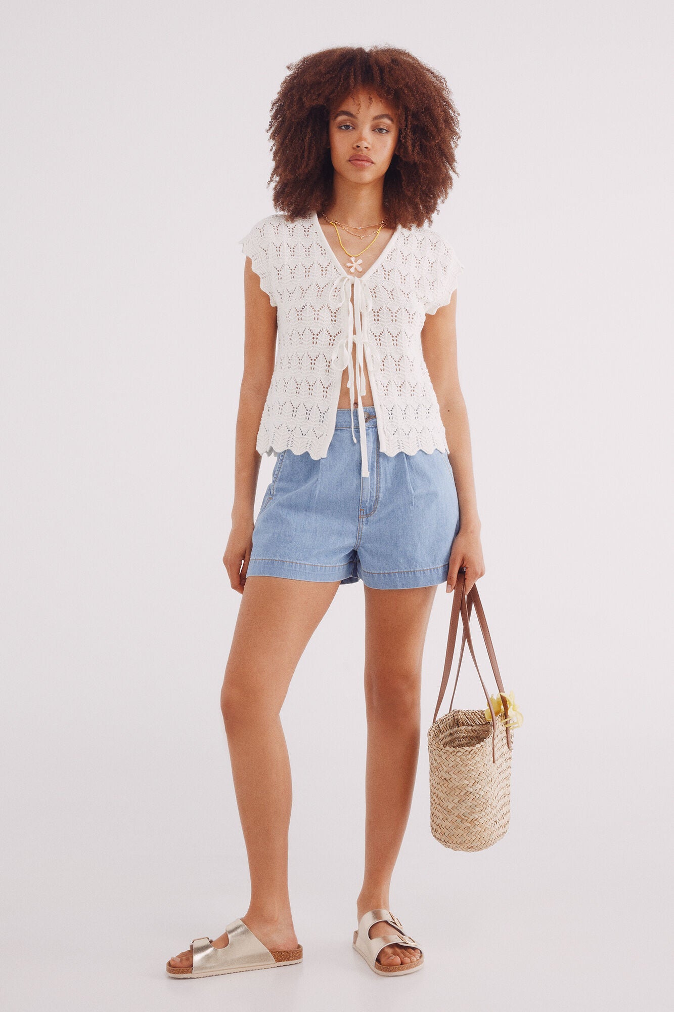 • Chaleco de punto con escote de pico, abierto con cierre de lazos, con detalles calados y con acabado de ondas en las mangas y en el bajo