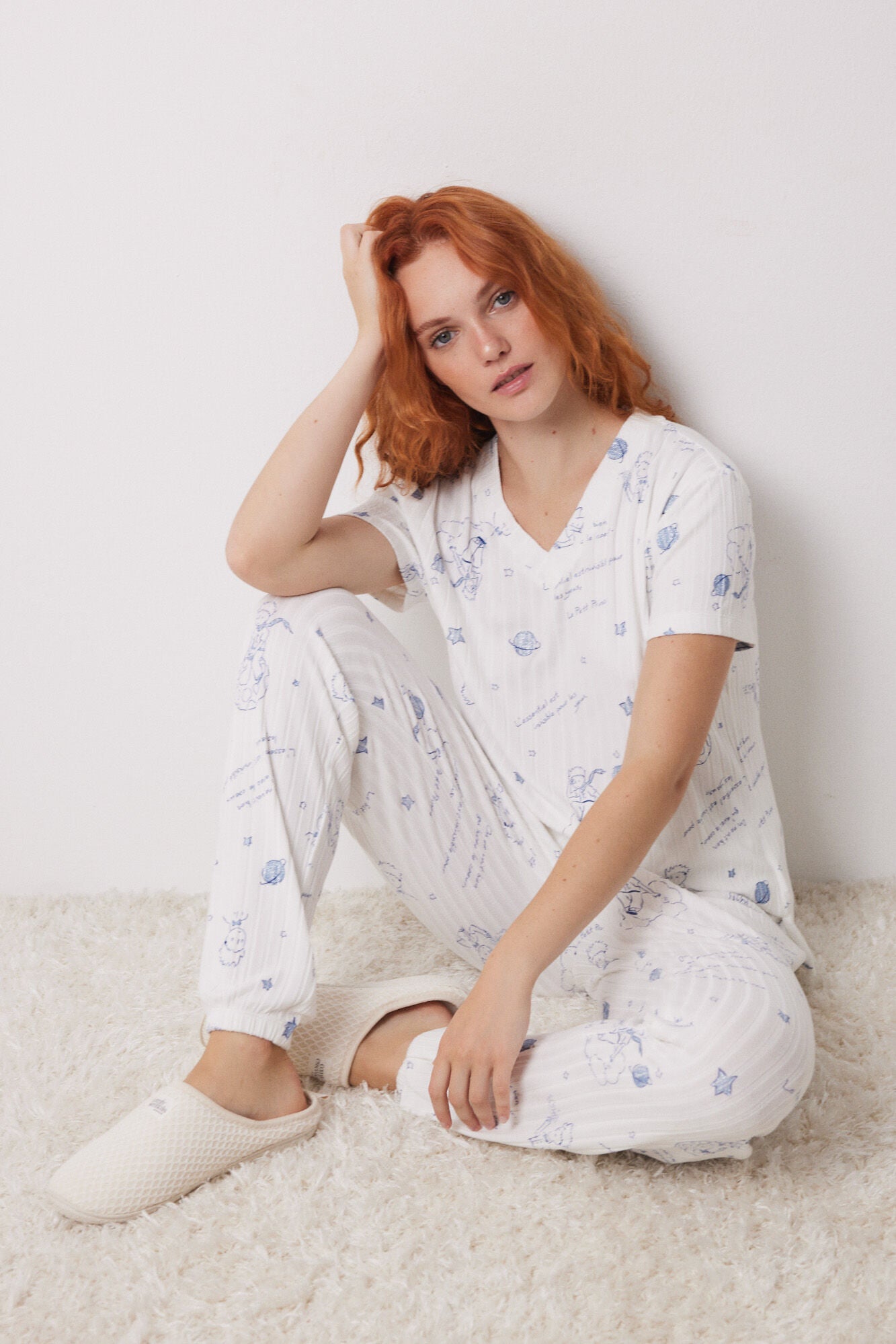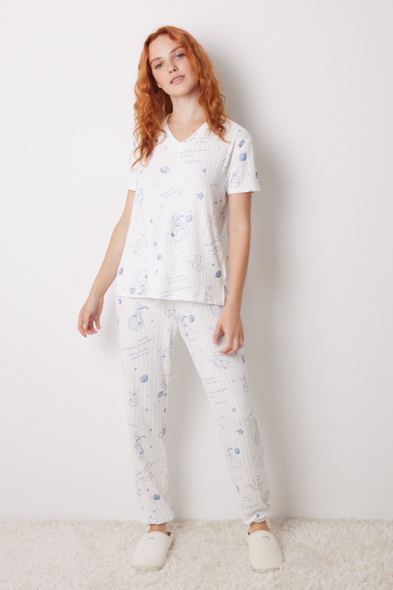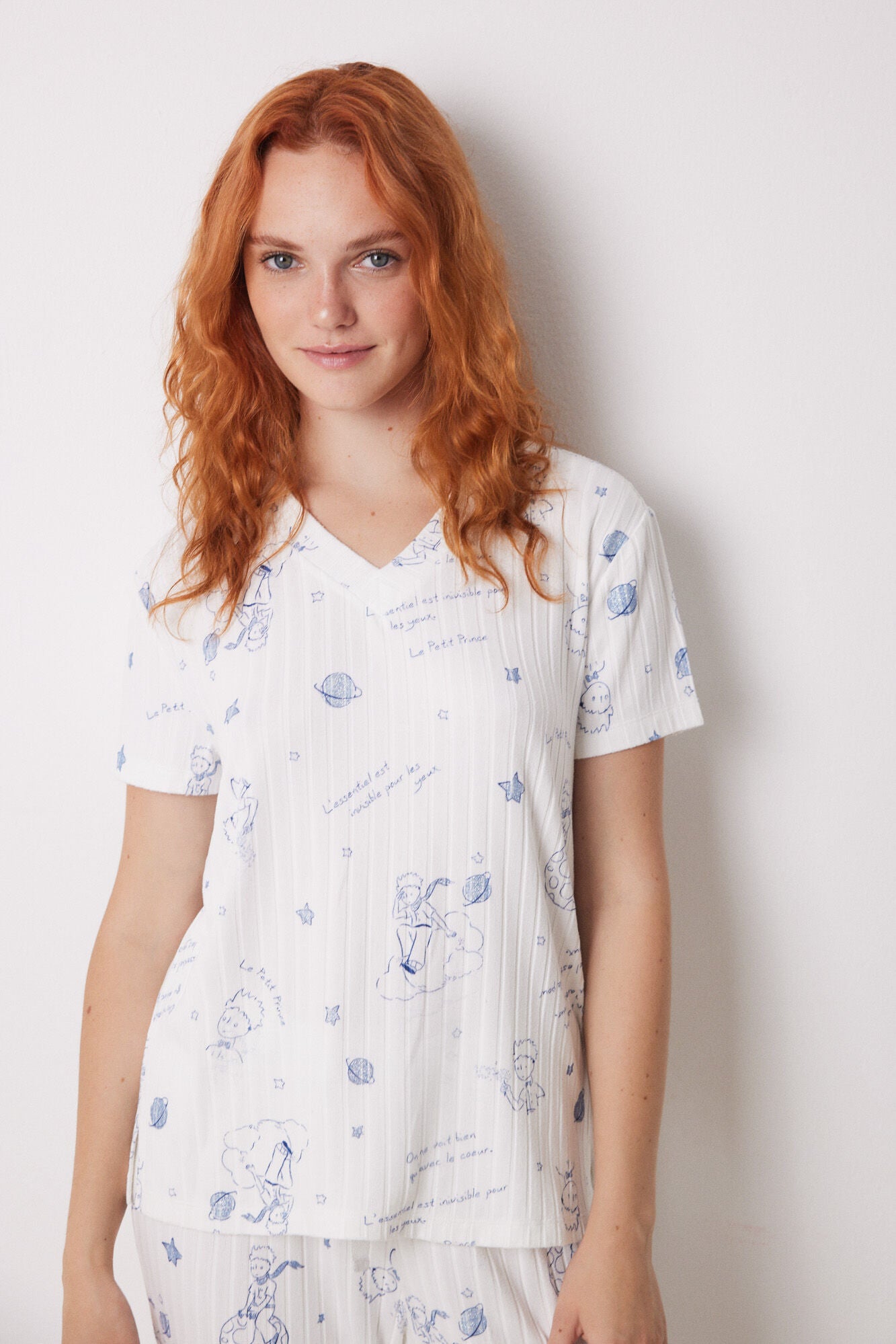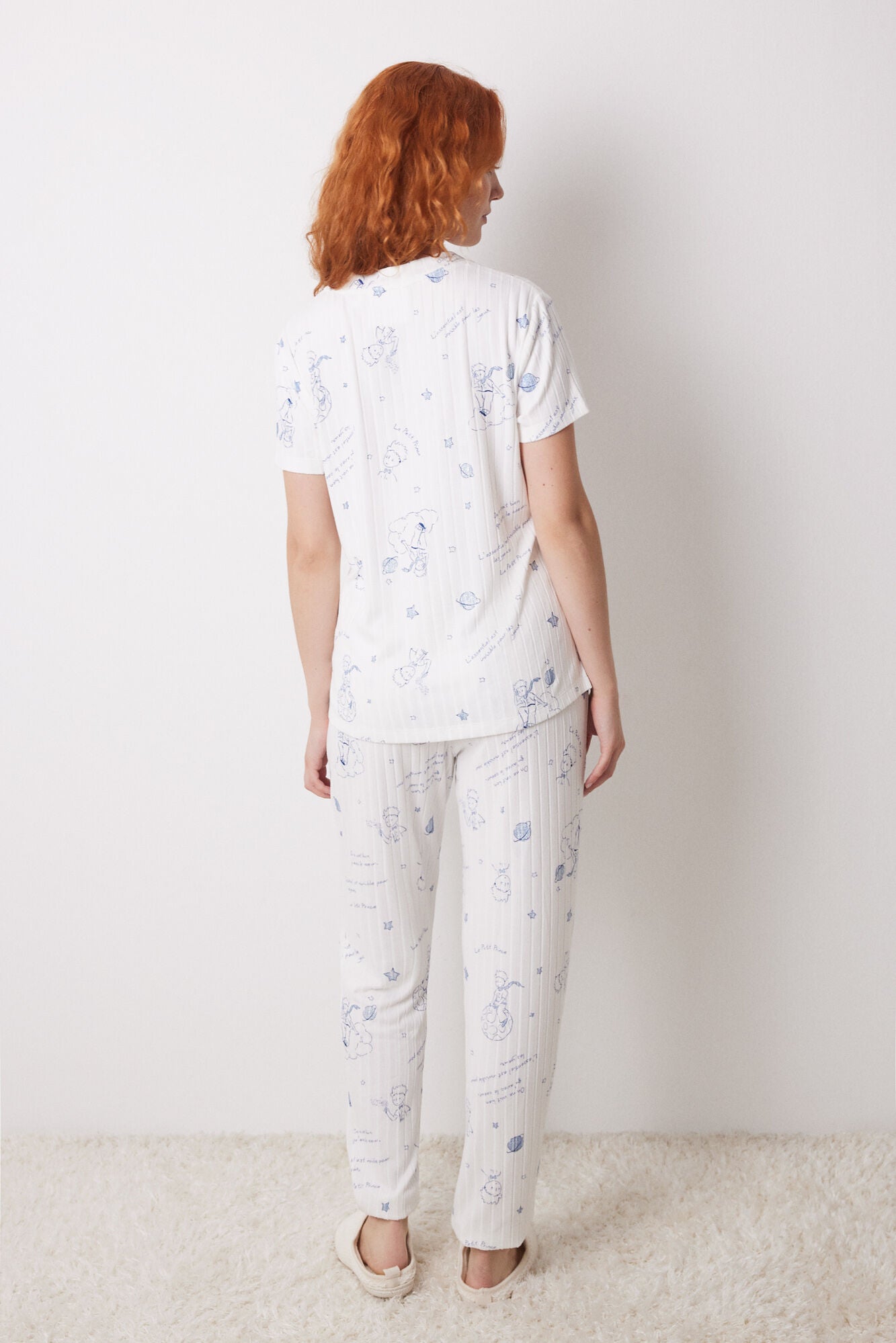 • Pijama de manga corta, confeccionado con tejido canalé súper soft, en color blanco con estampado allover de “El Principito” y detalles de lurex a contraste Ideal para estar en casa súper calentita y con estilo