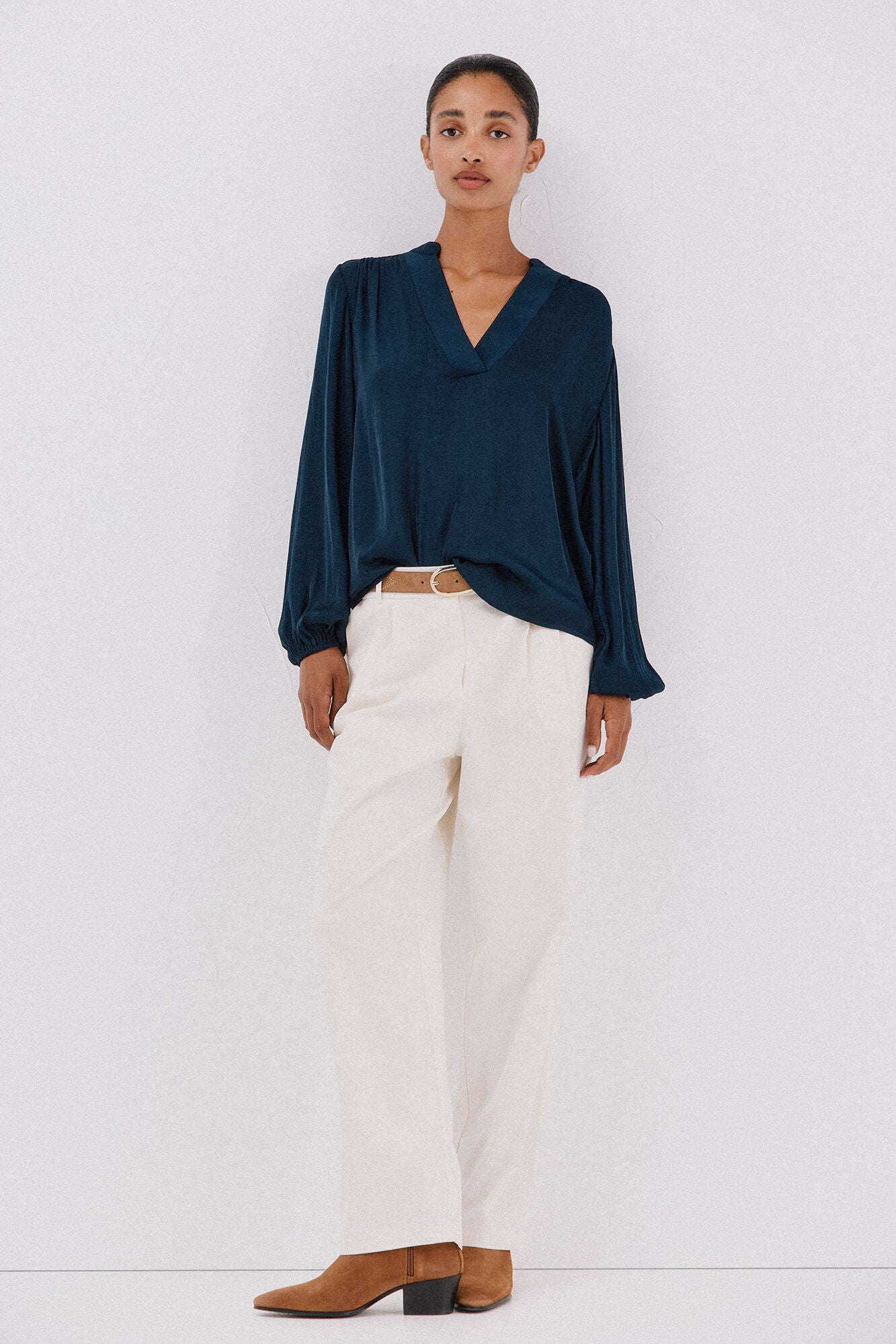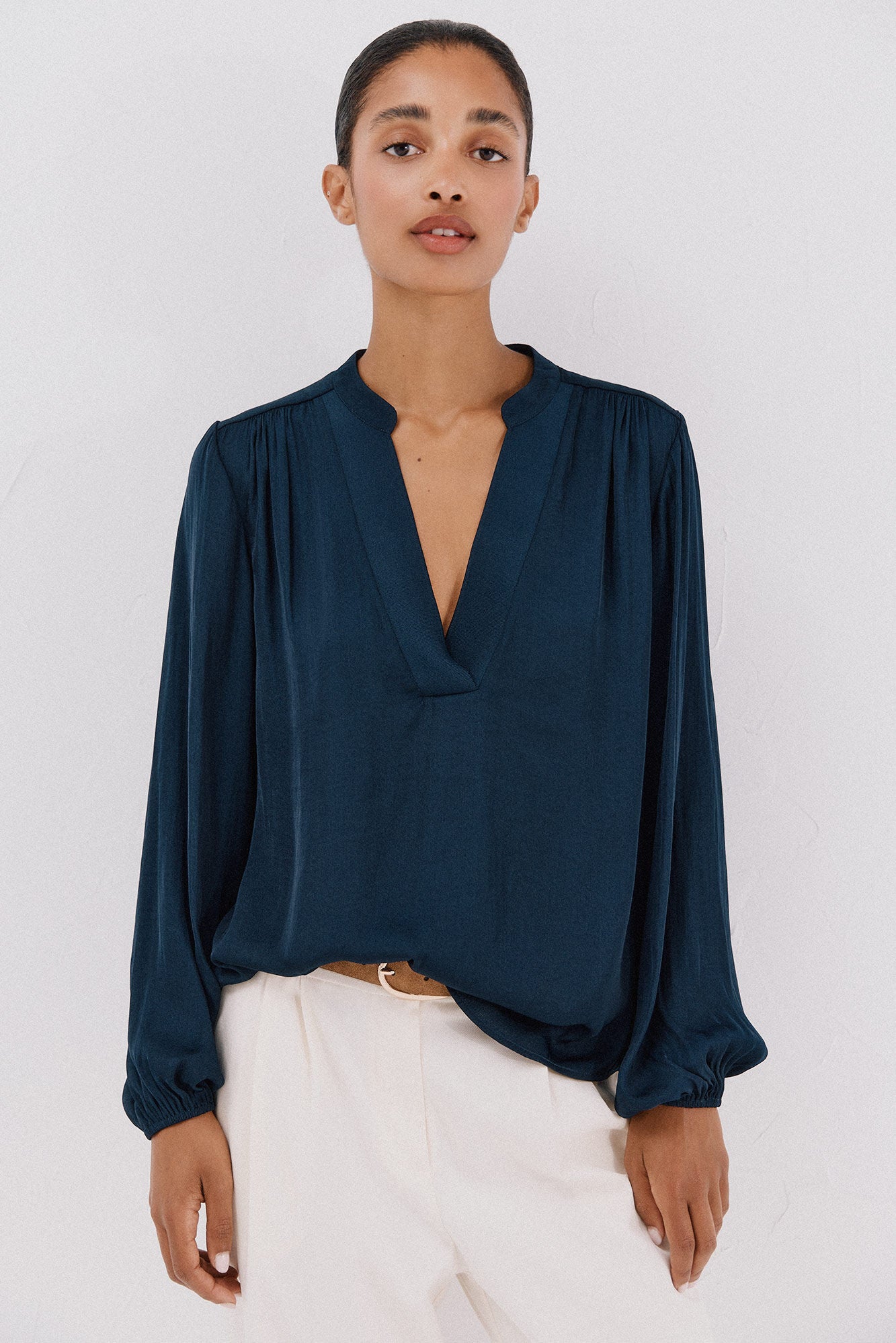 • Camisa fluida satinada de cuello redondo con escote pico y manga larga