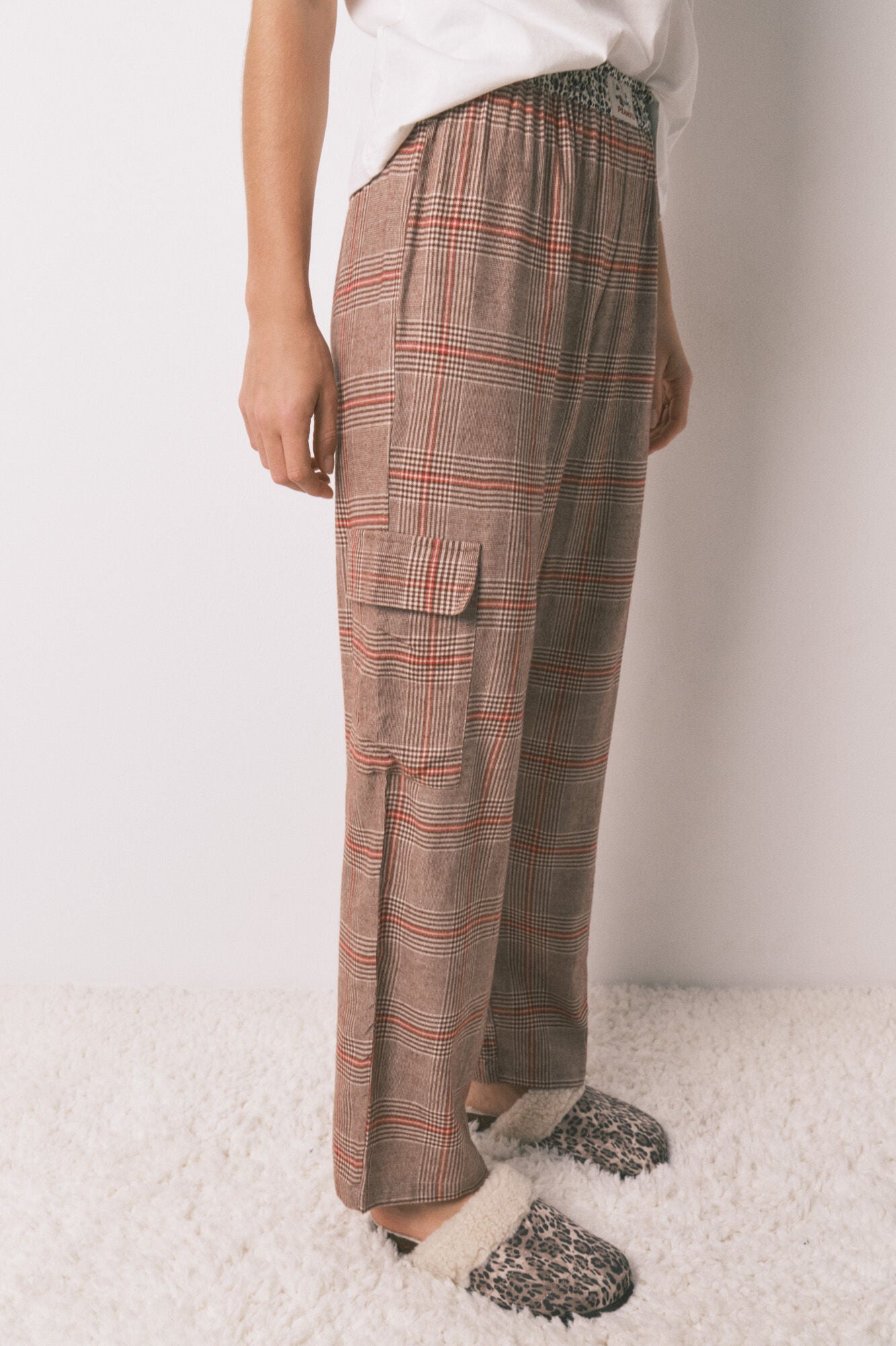 • Pantalón ancho con estampado a cuadros, bolsillos cargo a los lados y cinturilla elástica con estampado animal con detalle de etiqueta en contraste