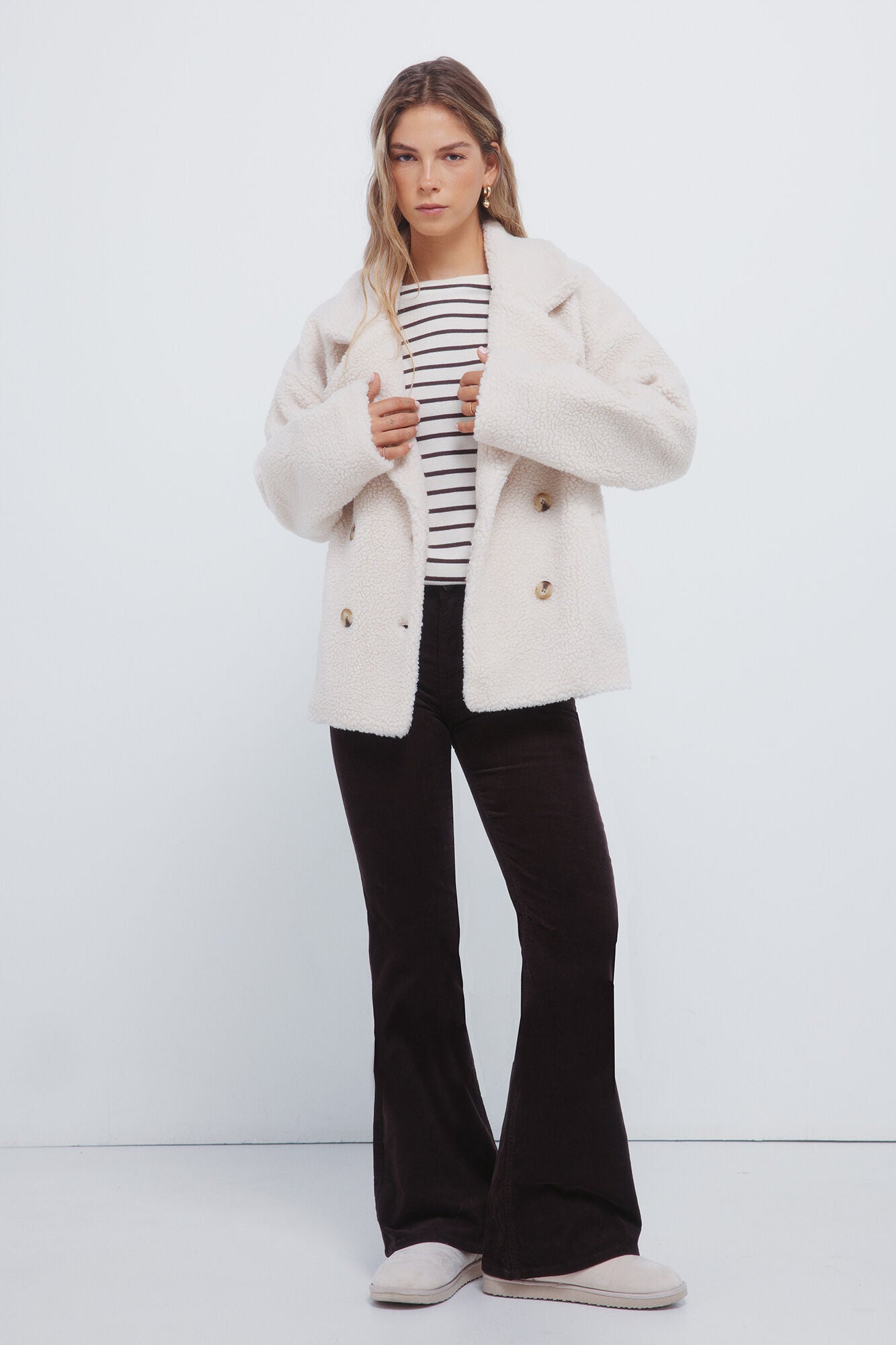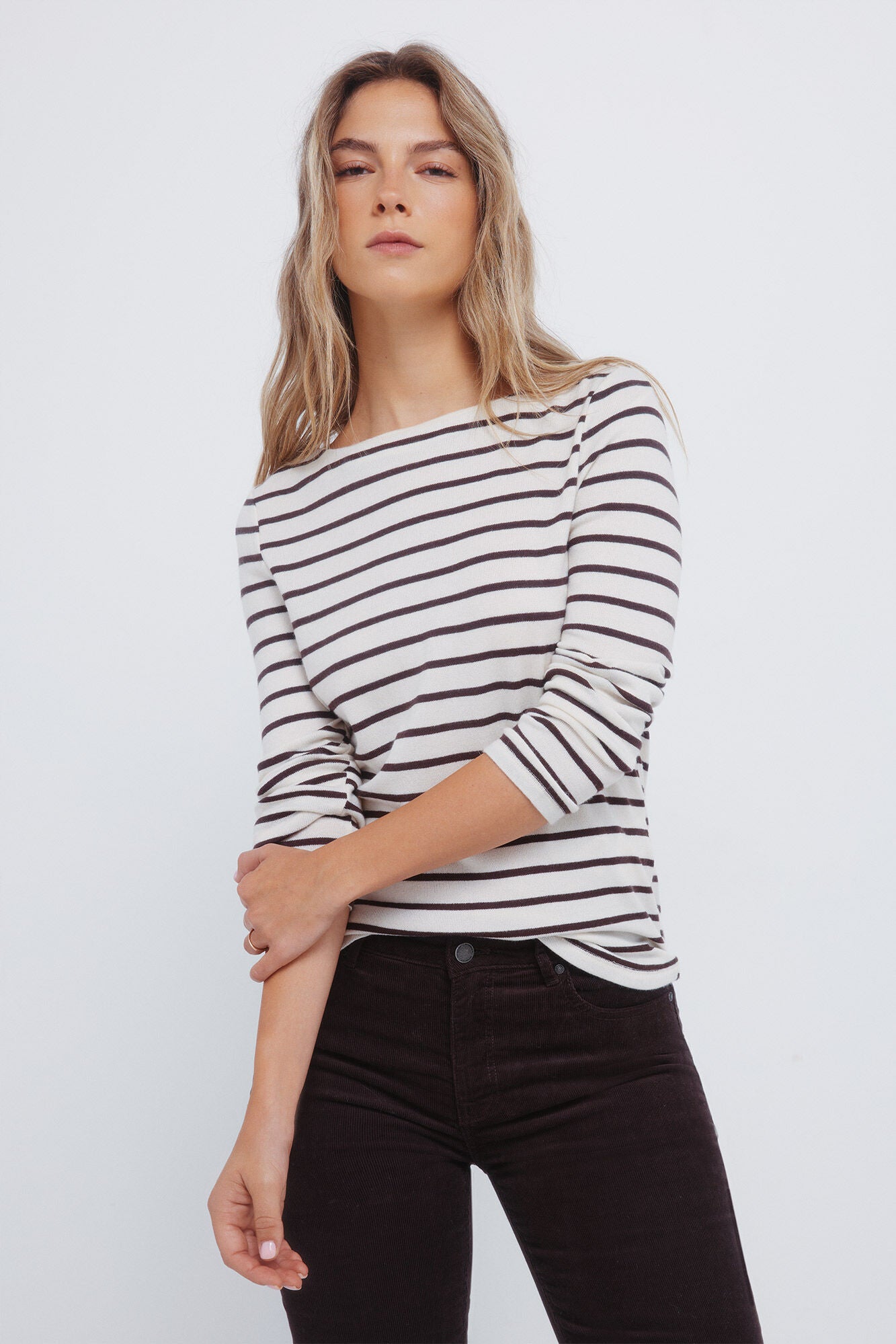 • Camiseta semi entallada de manga larga, con cuello estilo barca, con rayas horizontales y con tacto suave