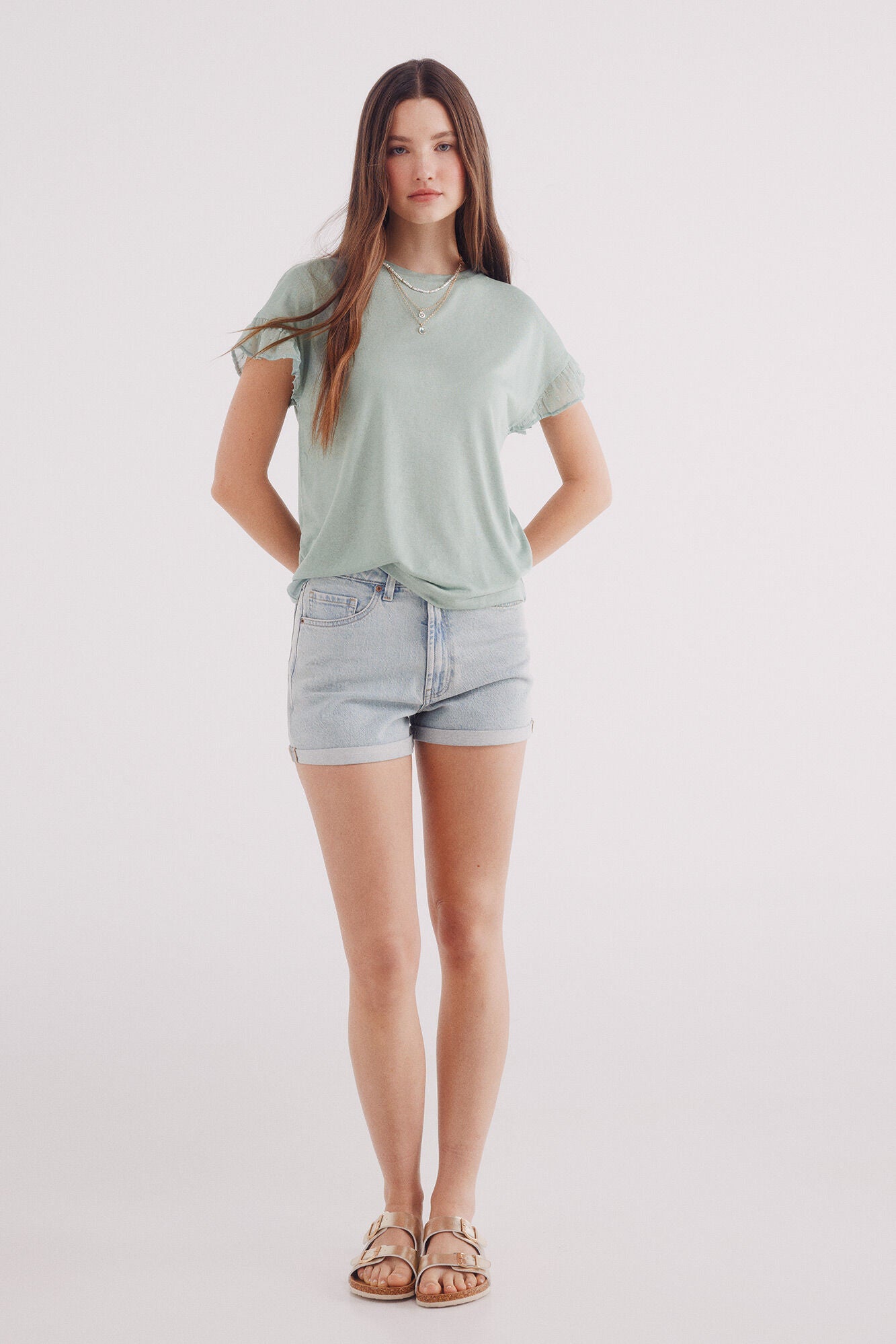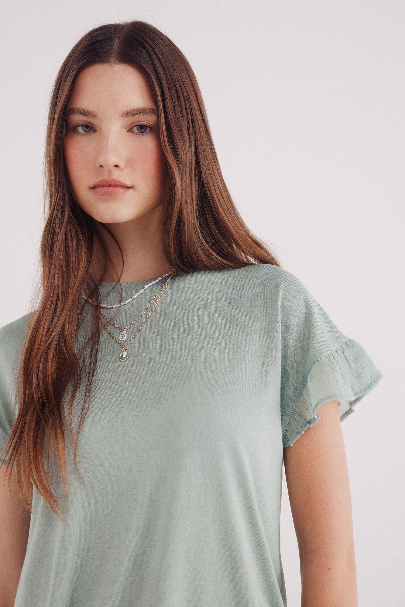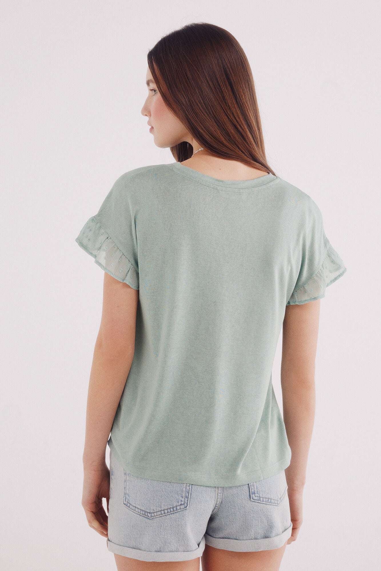• Camiseta recta de manga corta caída con detalle de volante de plumeti a tono y de color liso