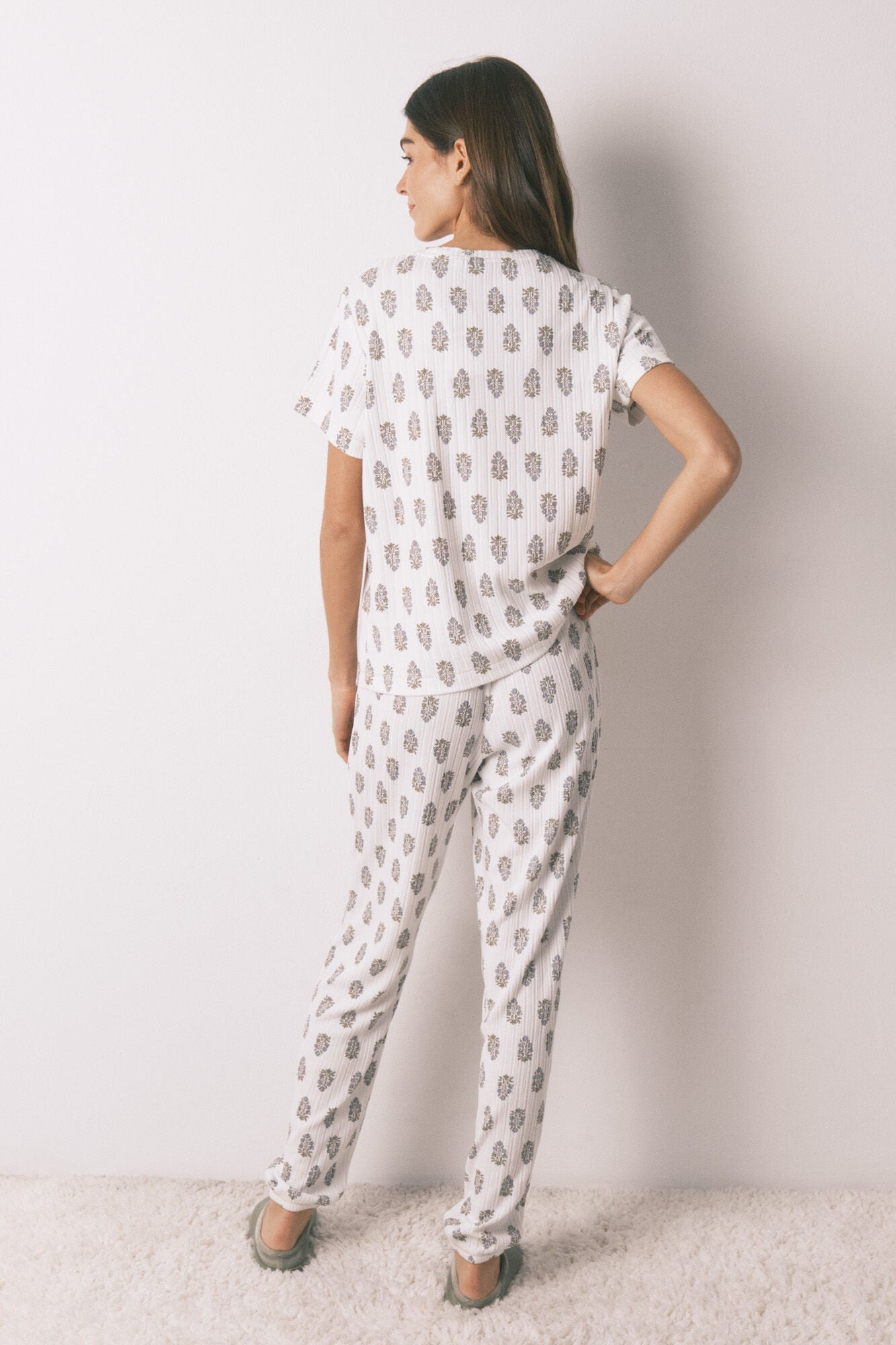 • Pijama de manga corta y pantalón largo con estampado de flores, confeccionado en tejido de punto super soft. Ideal para dormir o estar en casa con estilo