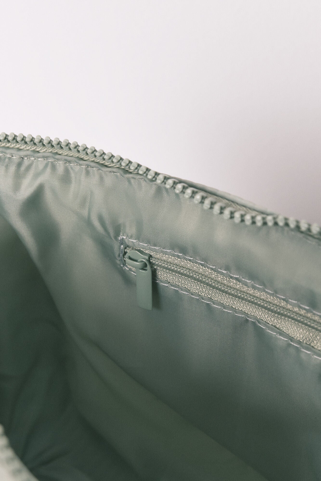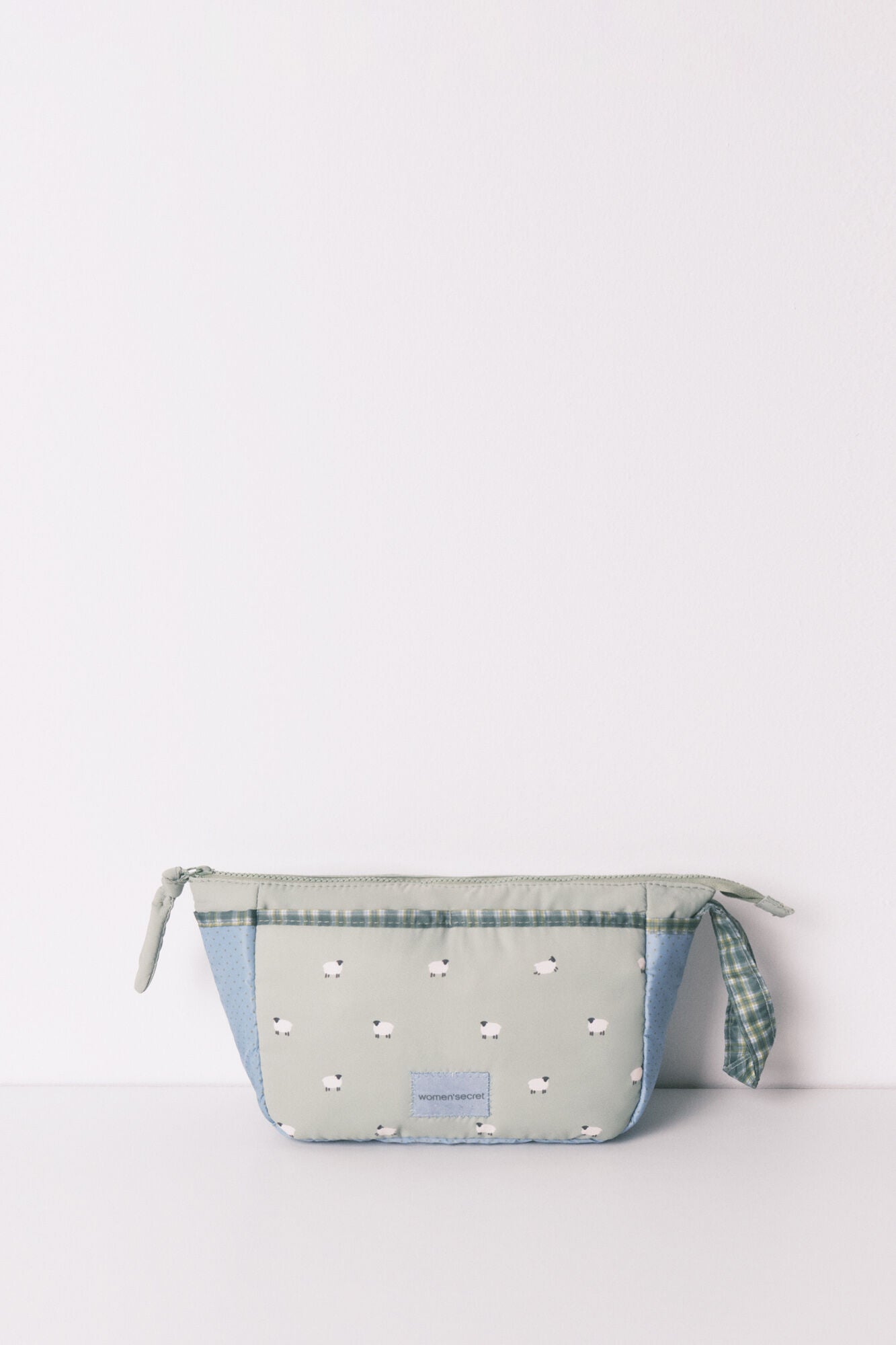 • Neceser mediano tipo estuche con cremallera y asa, confeccionado en nylon acolchado, con divertido estampado de ovejas y fondo verde