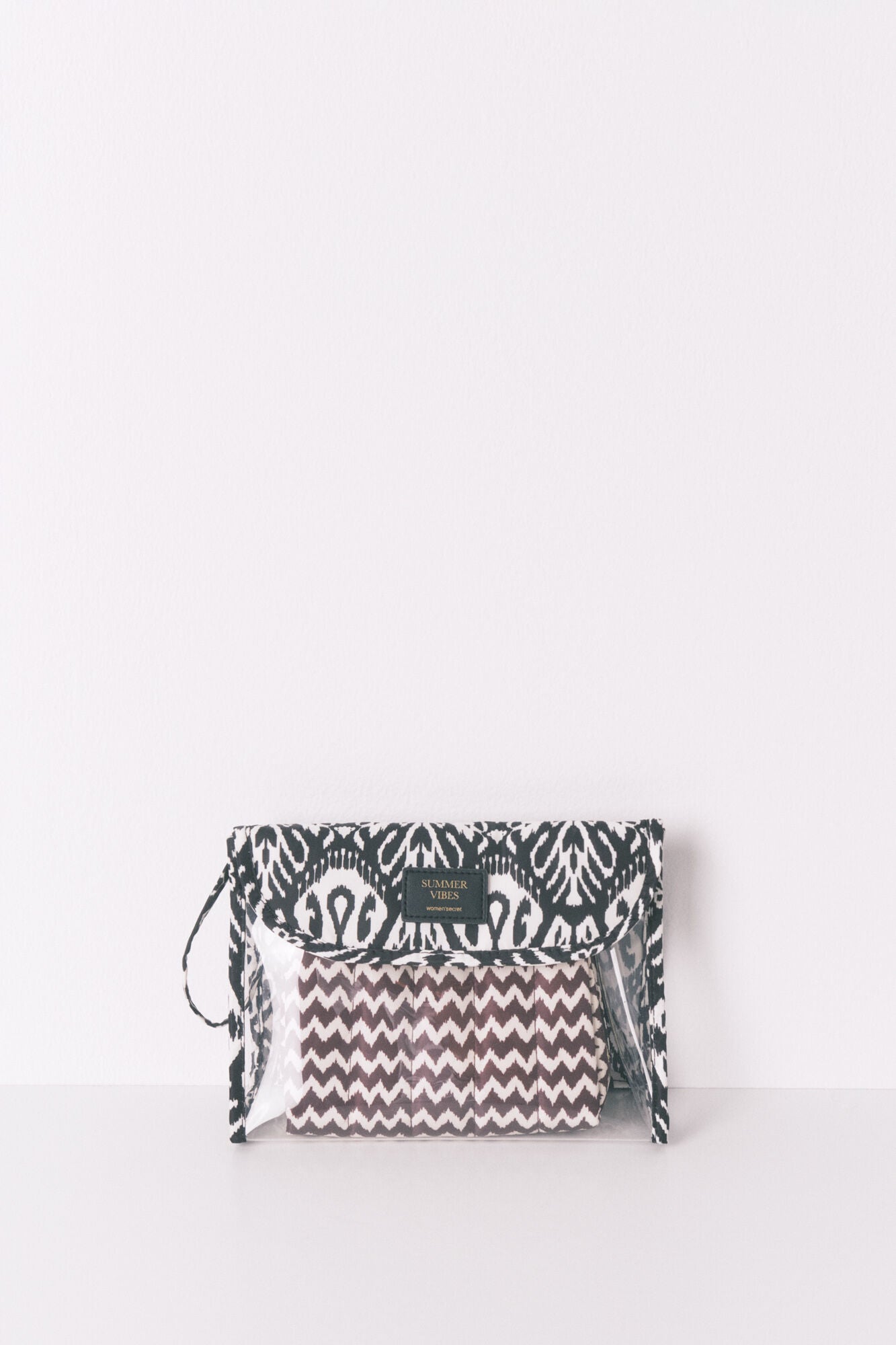 • Paquete de 2 neceseres, uno más grande transparente con partes estampadas, y otro más pequeño en su interior con estampado allover de zig zag. Ideal para organizar tus accesorios durante los viajes o llevar contigo a la playa o piscina.