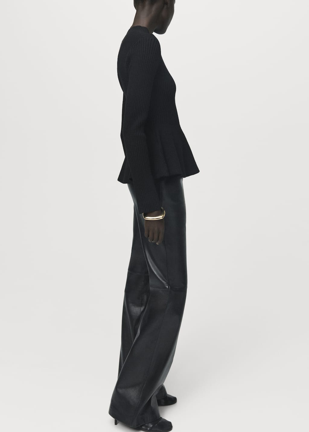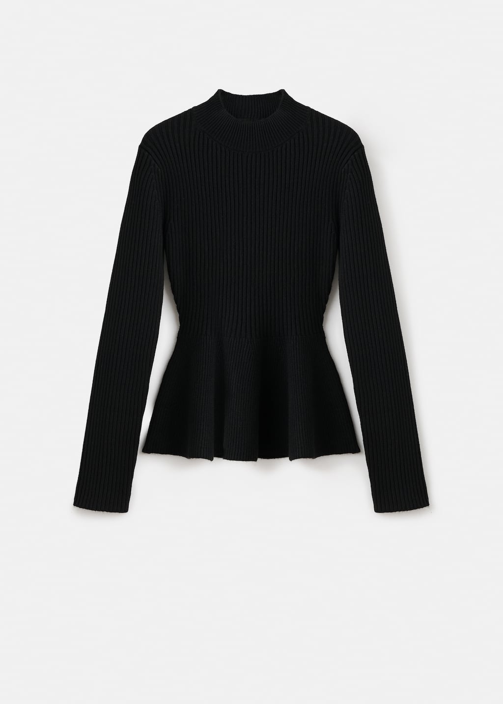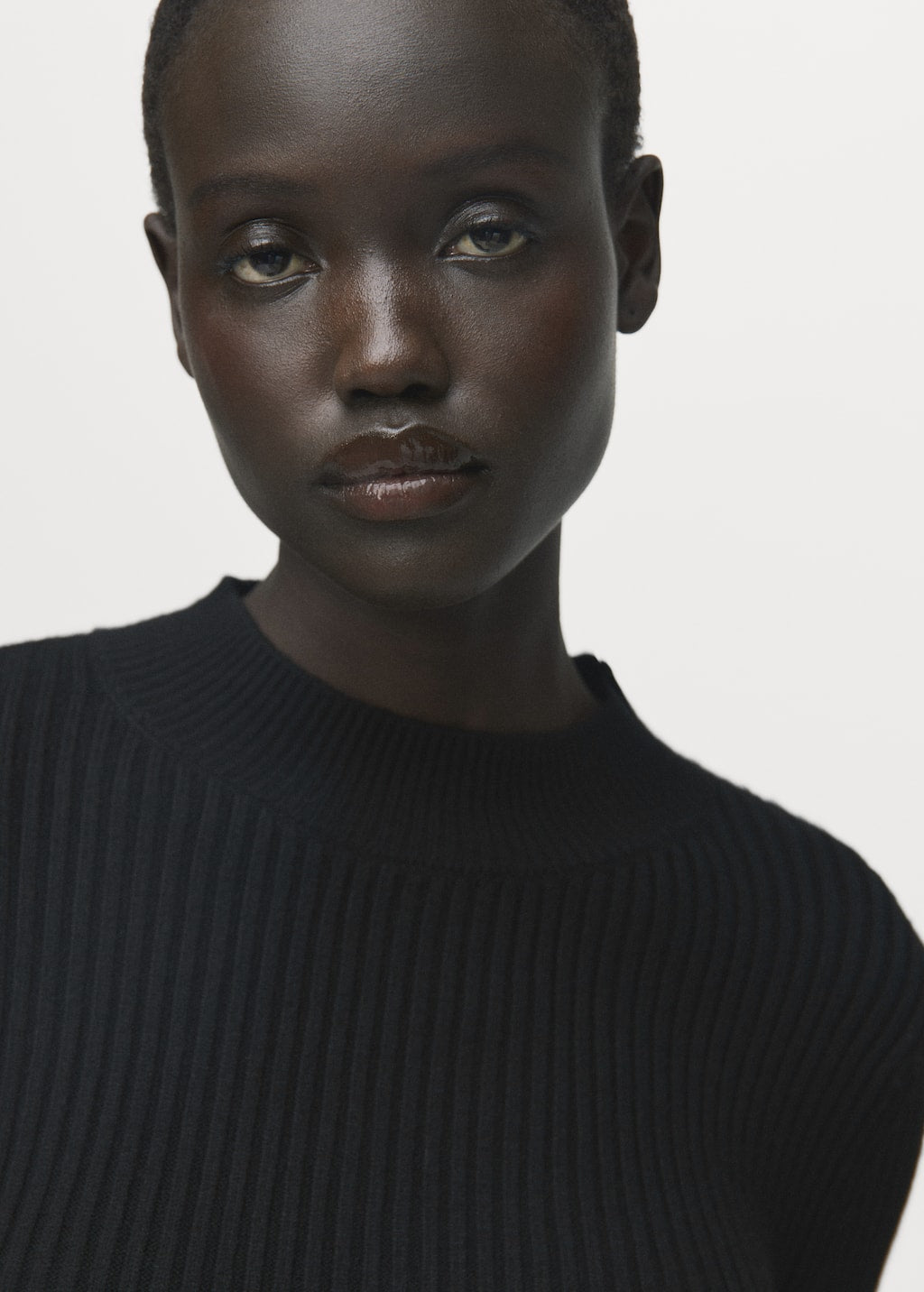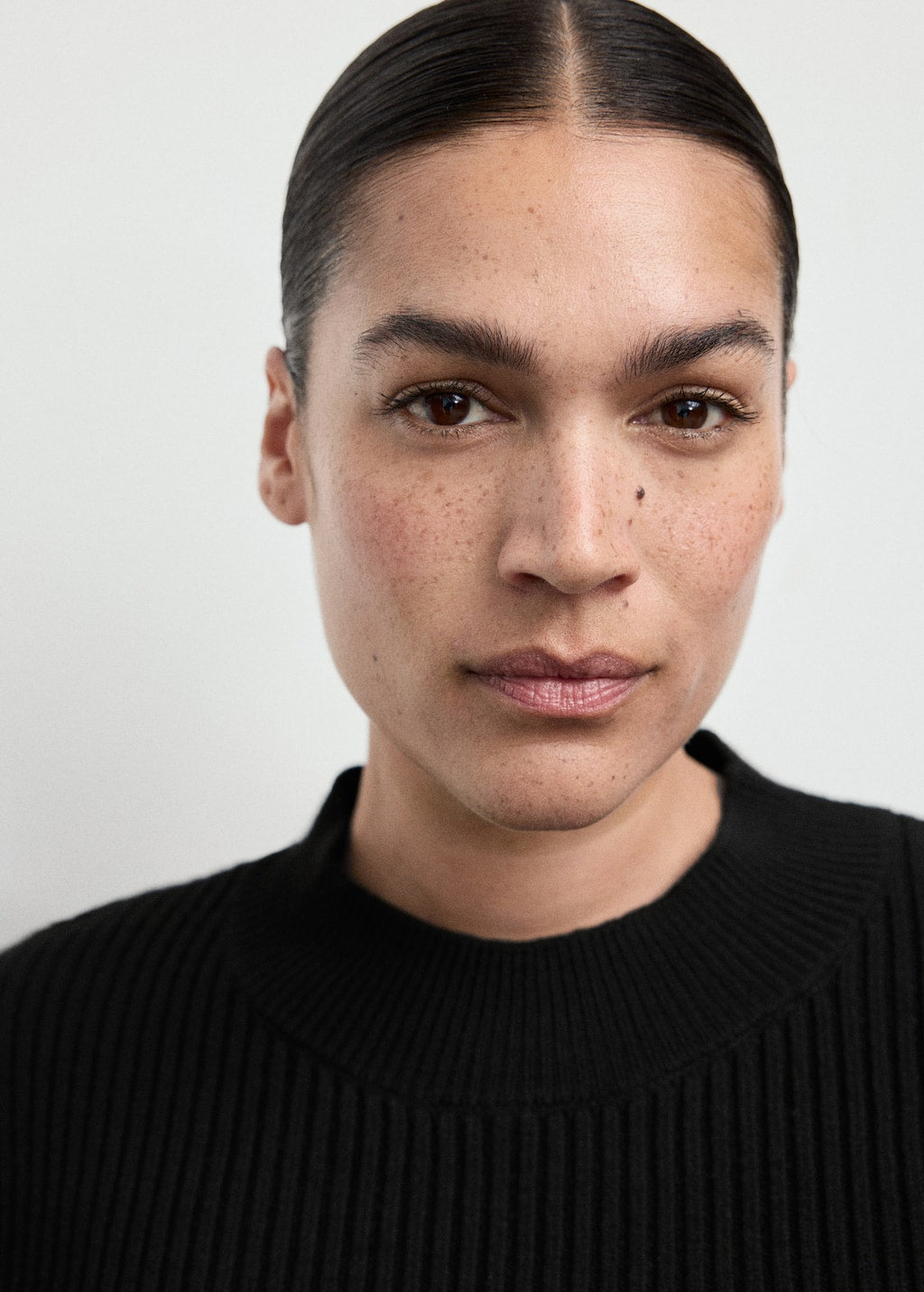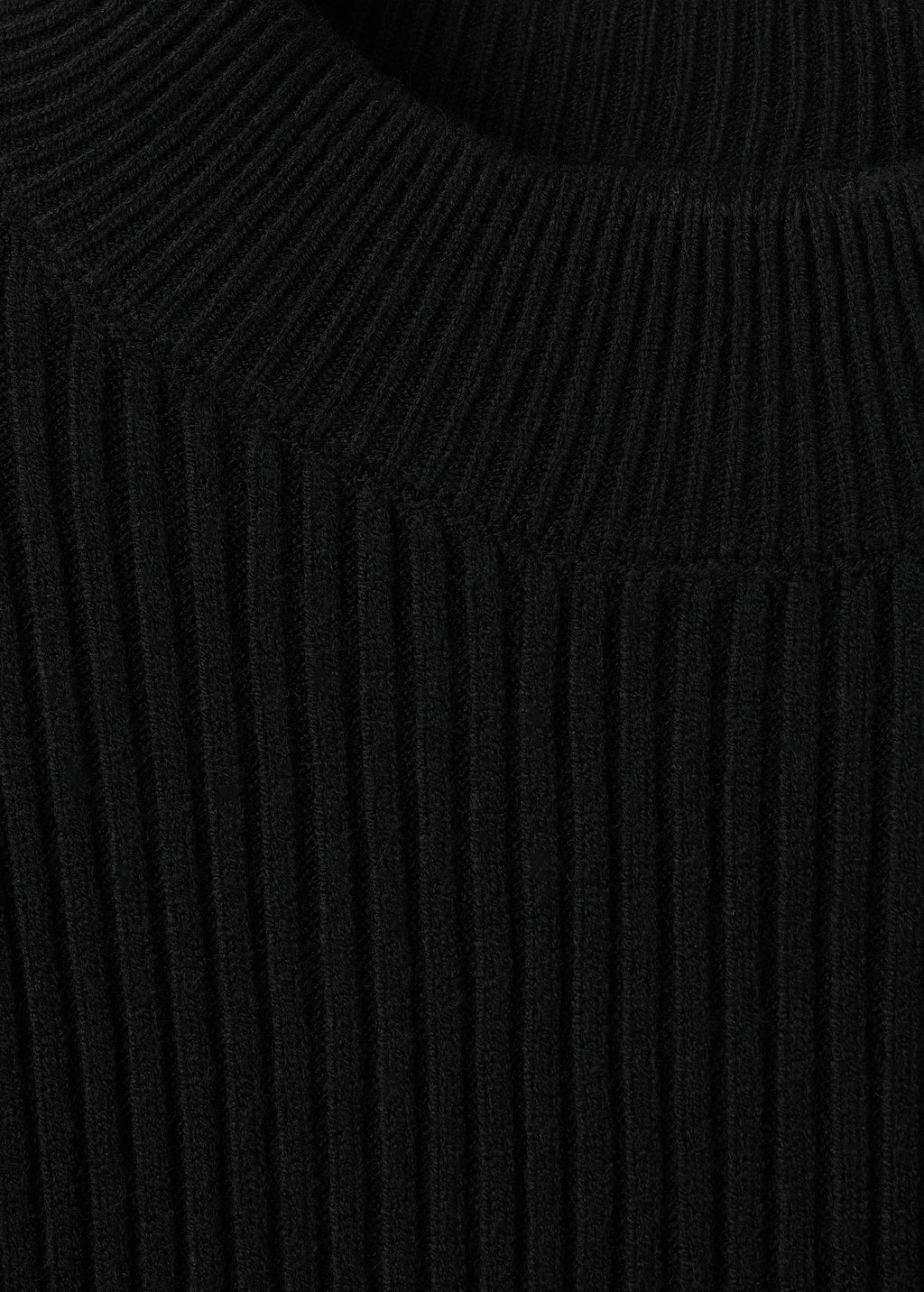 • Confeccionado en tejido de punto de canalé, este diseño presenta un corte, cuello caja y manga larga