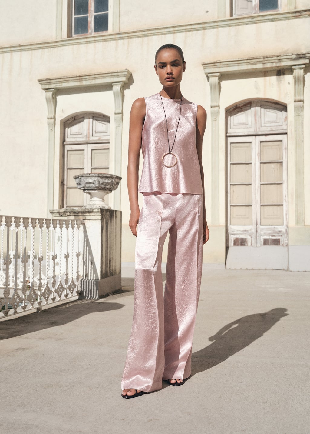 • Confeccionada en tejido satinado con efecto arrugado, esta prenda presenta un diseño recto con cuello redondo y manga sisa